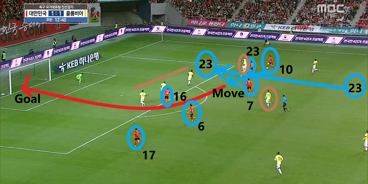 - 이 득점은 '김문환'(23번)의 움직임과 '이재성'(10번)의 우측면에서 중앙으로 이동하는 커트인(Cut-in) 플레이가 함께 어우러진 장면임. 먼저, 우측면에서 '이재성'(10번)이 볼을 잡았을 시 2명의 상대 수비수가 '이재성'을 마크(Mark)하고 있음. 순간적으로 후방에 위치하고 있던 '김문환'(23번)이 자신의 강점인 빠른 주력(Speed)을 이용한 오버래핑(Overlapping)으로 상대 수비 깊숙한 공간으로 이동하면서 '이재성'에게 집중하고 있던 상대 수비의 시선을 자신에게로 유도함. '이재성'은 분산된 상대 수비 시선을 활용하여 측면에서 중앙으로 이동하며 논스톱(Non-stop) 슈팅으로 득점에 성공함.