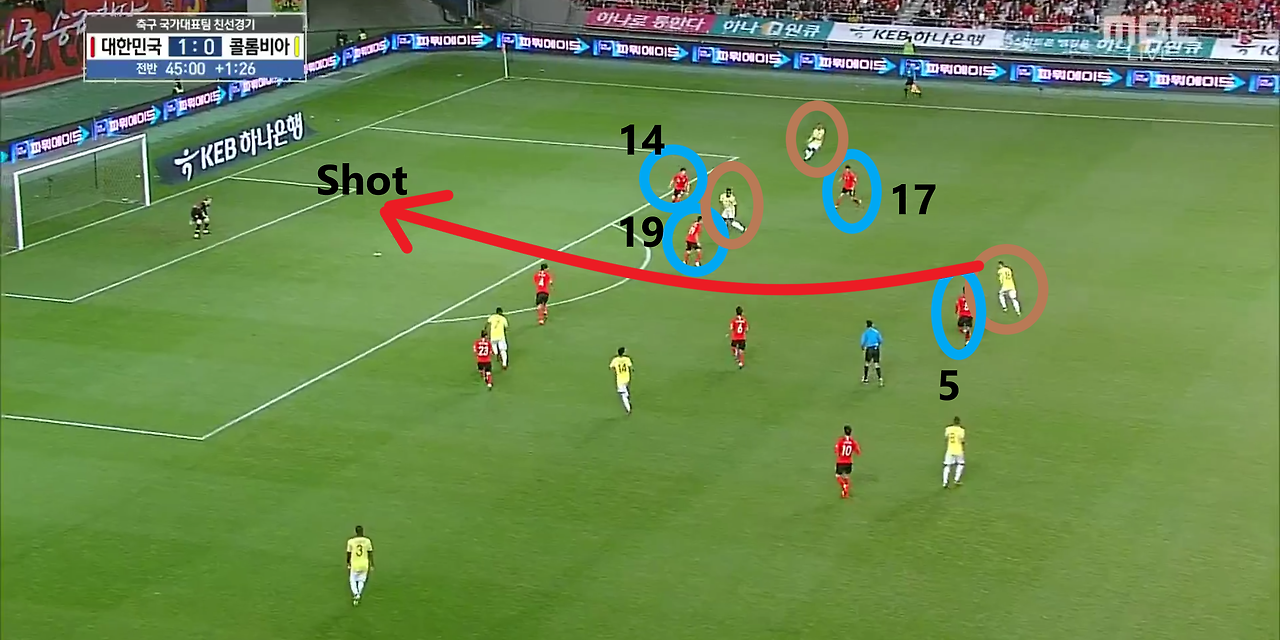 - 상대 미드필더(MF)가 중거리 슈팅(Shot)을 시도하는 장면임. 주변에 '정우영'(5번)이 있었지만, 볼을 잡은 선수의 슈팅 각도를 좁혀주지 못하며 자유로운 시도를 가능케 함. 이때, 상대 공격자원들의 움직임도 또한, 슈팅을 할 수 있도록 공간을 만들어주었다고도 볼 수 있음. 최전방 공격수는 최후방 수비수인 '김영권'(19번)과 '홍철'(14번)의 움직임을 제한시키며, 상대 공격 방향 우측의 선수는 '이청용'(17번)의 움직임을 방해함. 이 상대의 두 선수 모두 공격적으로 움직이며 수비의 시야를 빼앗고 자신에게 집중할 수 있도록 유도함.