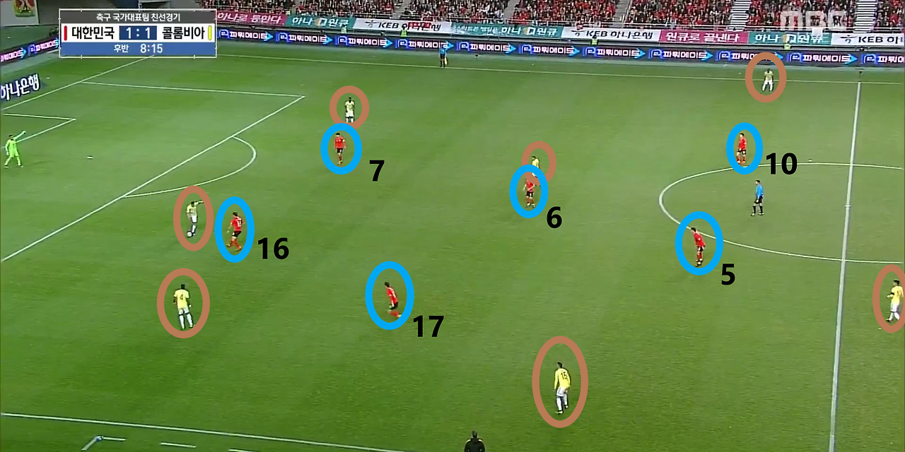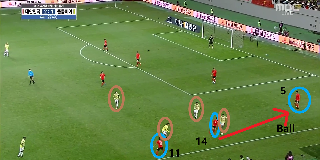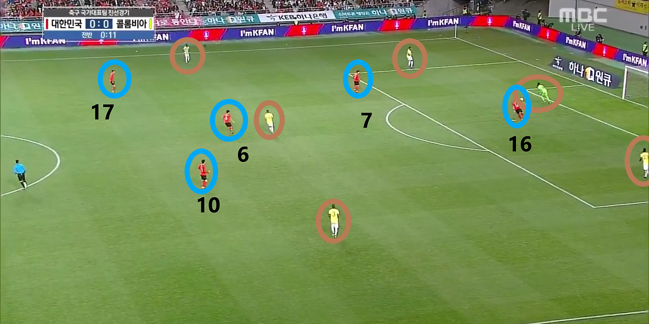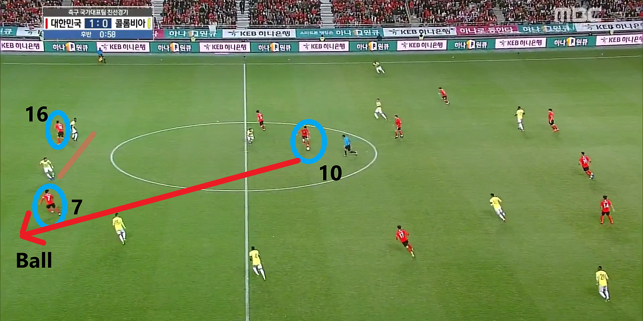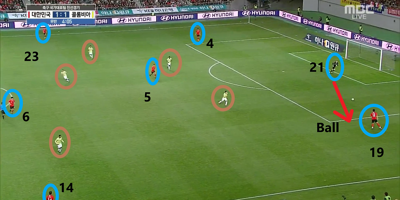 - 경기 초반 상대가 자기 진영에서 볼을 소유할 시 공격자원들의 깊숙한 전방압박을 확인할 수 있는 장면임. 볼은 상대 골키퍼(GK)에게 있으며 이때, 최전방 투톱 공격수(Two-top) '손흥민'(7번)과 '황의조'(16번)가 강한 압박을 시도함. 동시에, 미드필더 자원들['이청용'(17번), '황인범'(6번), '이재성'(10번)]도 라인을 올리면서 상대의 미드필더(MF) 자원들을 마크(Mark)함. 강한 전방압박으로 상대 골키퍼는 볼을 전달할 선택지가 좁아짐(위의 상황에서는 멀리 걷어냄.).