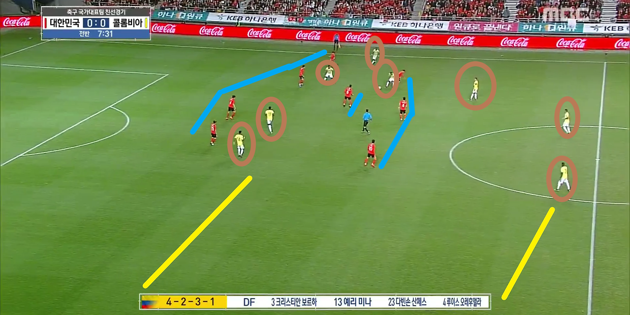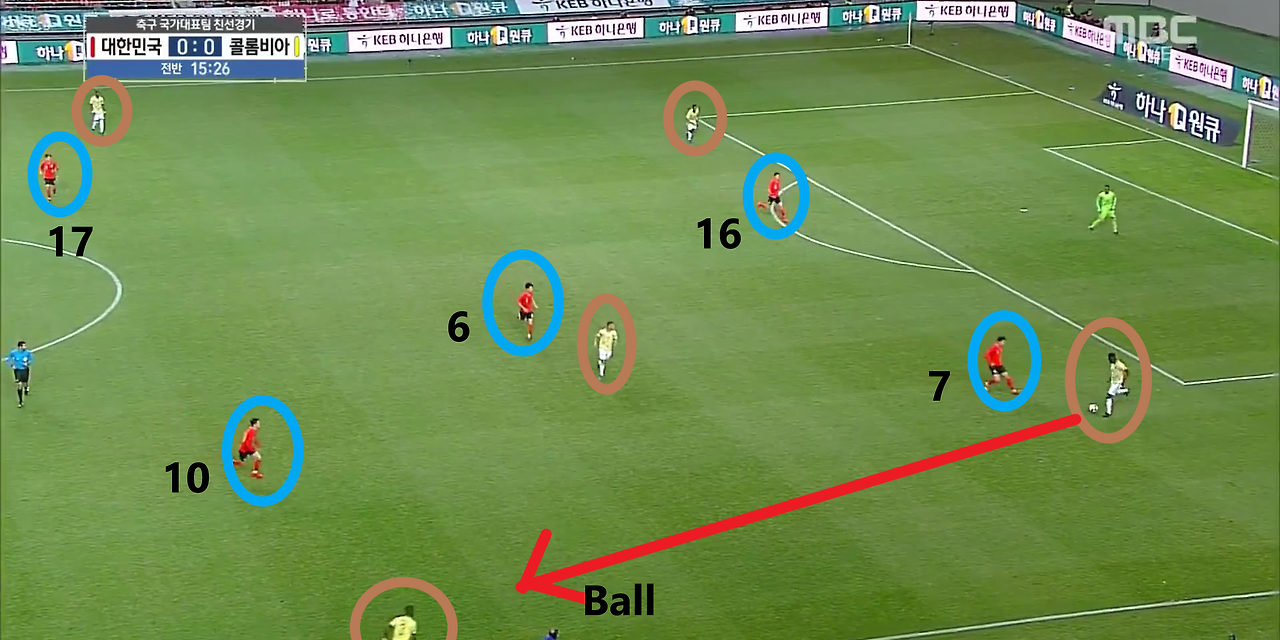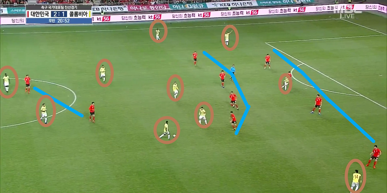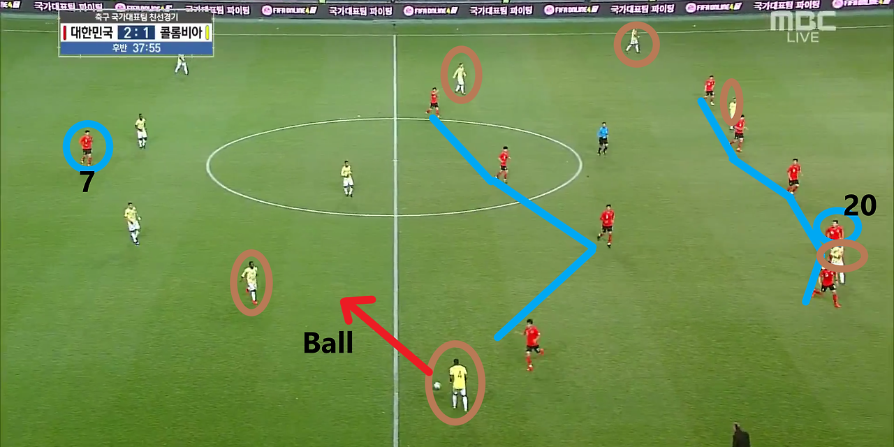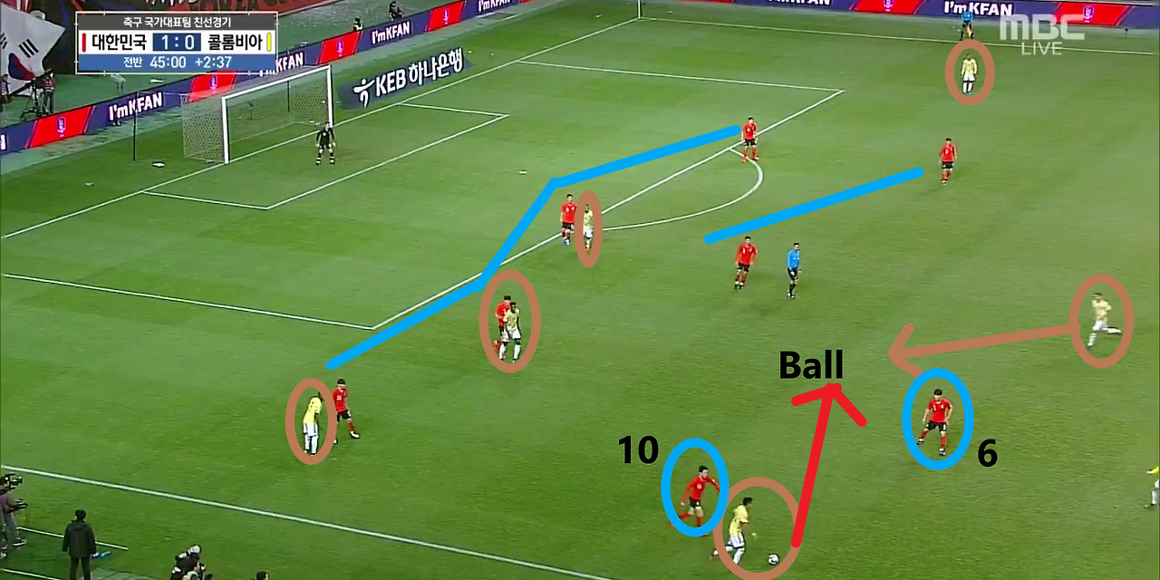 - 경기 초반 상대가 자기 진영에서 볼을 소유할 시 공격자원들의 깊숙한 전방압박을 확인할 수 있는 장면임. 볼은 상대 골키퍼(GK)에게 있으며 이때, 최전방 투톱 공격수(Two-top) '손흥민'(7번)과 '황의조'(16번)가 강한 압박을 시도함. 동시에, 미드필더 자원들['이청용'(17번), '황인범'(6번), '이재성'(10번)]도 라인을 올리면서 상대의 미드필더(MF) 자원들을 마크(Mark)함. 강한 전방압박으로 상대 골키퍼는 볼을 전달할 선택지가 좁아짐(위의 상황에서는 멀리 걷어냄.).