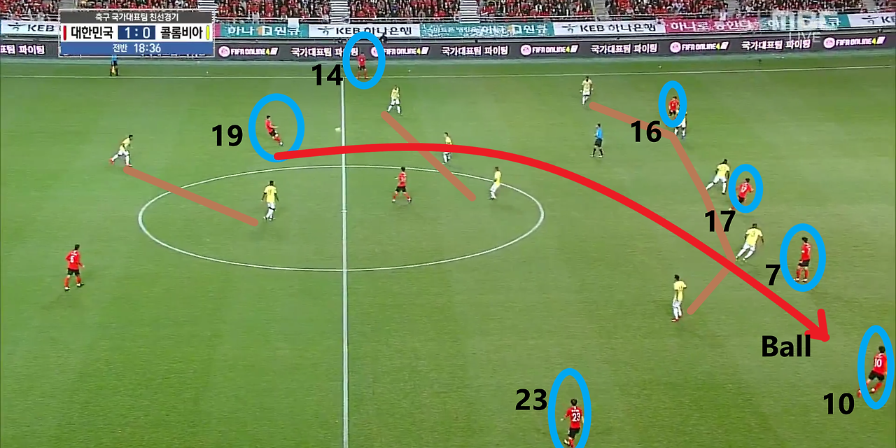 - 라인을 올린 상대 최종 수비 배후 공간 침투를 시도하는 공격 장면임. '김영권'(19번)이 상대 배후 공간으로의 움직임을 보이는 '이재성'(10번)에게 볼을 연결함. 이때, 공격자원 4명['황의조'(16번), '이청용'(17번), '손흥민'(7번), '이재성']이 모두 상대의 최후방 수비수(Center-back)와 동일 선상에서 움직임. 상대는 5백(Five-back) 수비를 펼치지만, 수비 라인이 완전한 형태가 아니며 공격자원의 숫자가 비슷하기에 공격자에게 유리한 상황임.