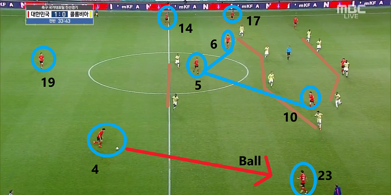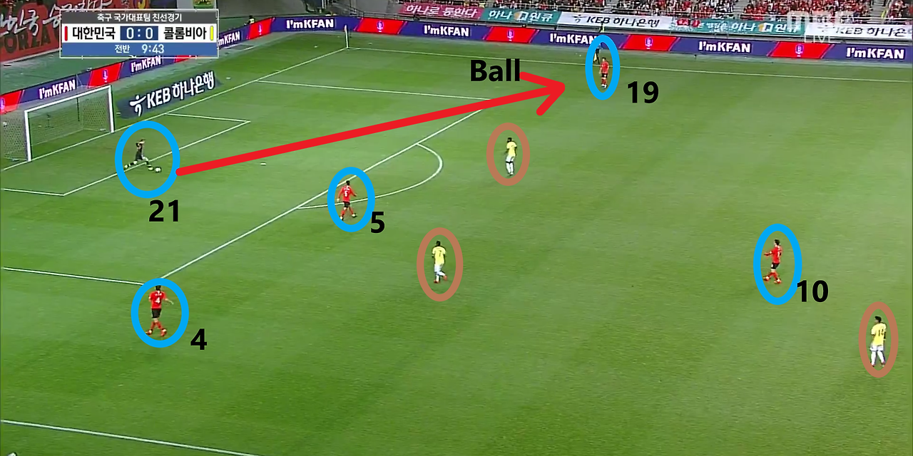 - 골키퍼(GK) '조현우'(21번)가 중앙 수비수(Center-back) '김영권'(19번)에게 볼을 전달하면서 공격을 시작함. '김민재'(4번)와 '김영권'은 페널티 박스(PK) 가장자리 부근으로 이동하며 공격의 폭을 넓힘. 기존 이들의 위치에 '정우영'(5번)이 볼을 받기 위해 이동함. 이때, 상대 공격자원들의 수비 위치를 보면, 라인이 전체적으로 올라온 상황에서 전방압박을 행하며 공격 전달을 방해하고자 함.