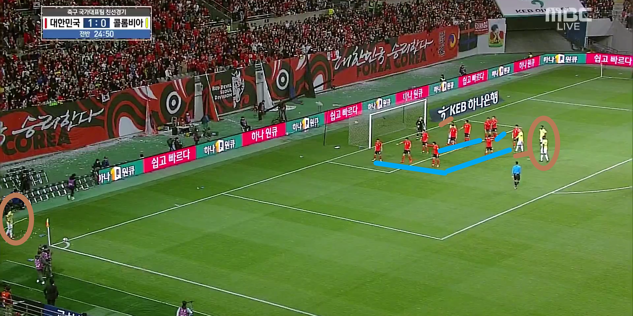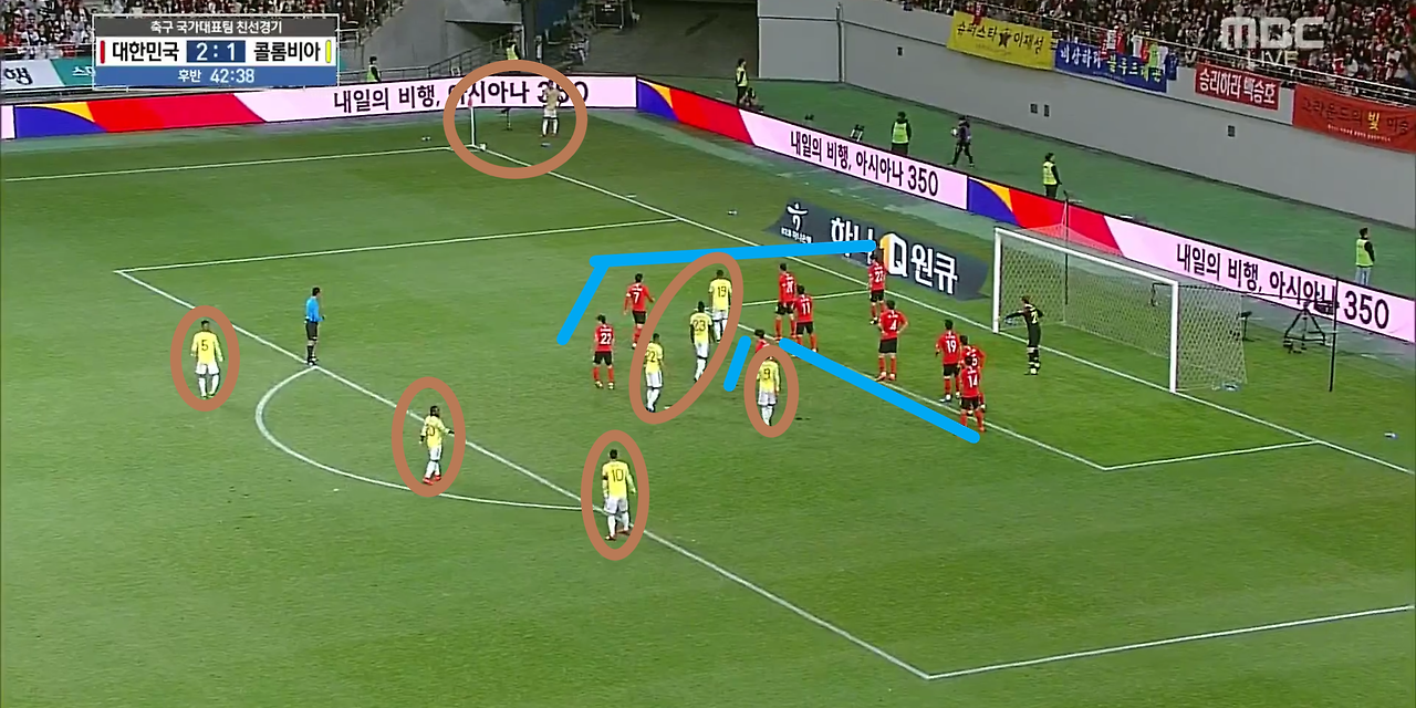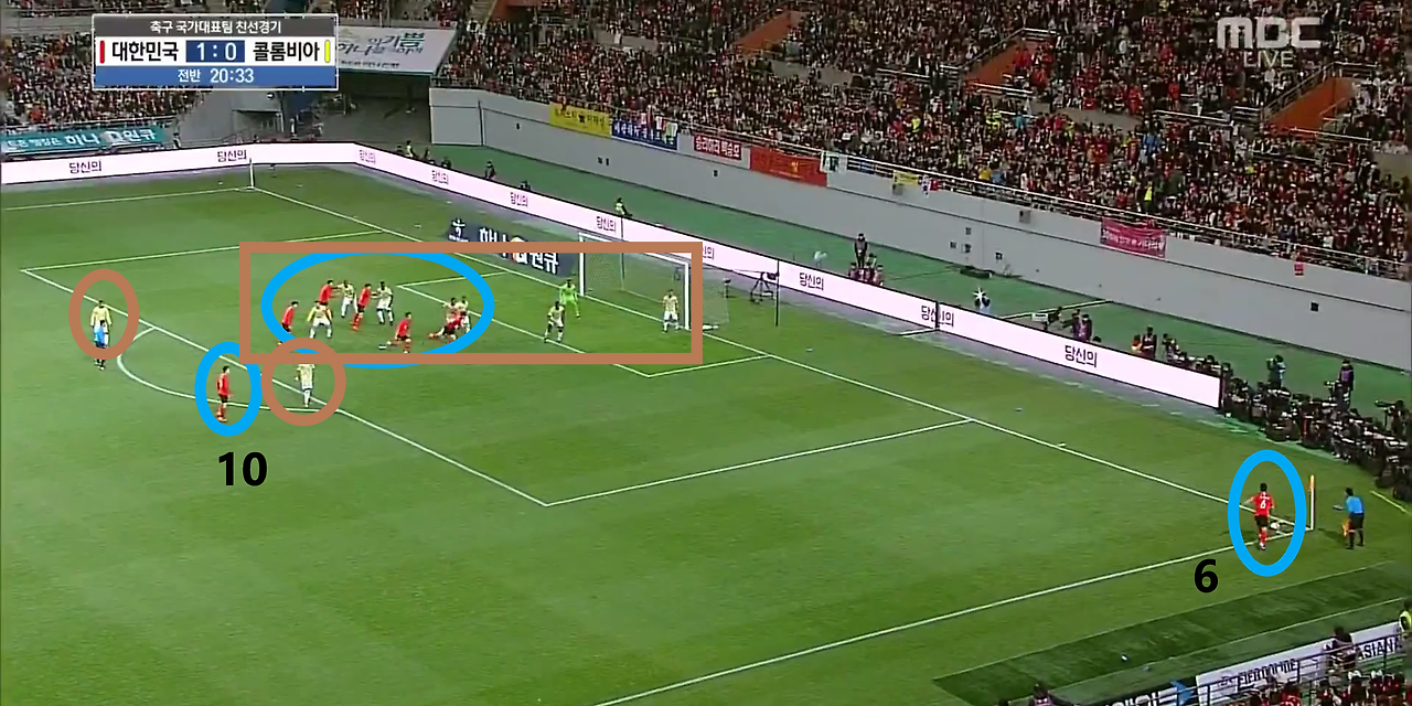 - 코너킥 공격 상황에서 상대 페널티 박스 내부의 선수 배치를 확인할 수 있는 장면임. 키커(Kicker) '손흥민'(7번)이 킥(Kick)을 차기 전 박스 내부에는 5명의 선수가 골문과 가까운 지역(Near-post), 중간 지역(Middle-post), 먼 지역(Far-post)에 각각 배치되어있음. '손흥민'이 찬 볼은 '김민재'(4번)의 헤더(Header)를 노림. 이때, '황인범'(6번)은 박스 외곽에서 약속된 전술을 기다리는 척 상대 수비의 움직임을 유도함.