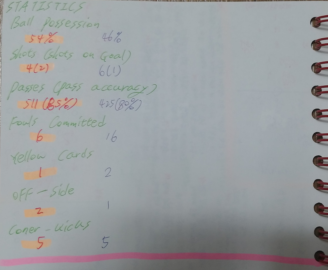 - 상대보다 높은 점유율(54%)과 많은 패스량(511회)을 보였으나, 슈팅(4회-유효슈팅 2회) 숫자가 상대(6회-유효슈팅 1회)보다 적은 점을 통해 보면, 볼을 상대 진영 깊숙한 지역까지 연결하는데 어려움이 있었다고 생각할 수 있음. 혹은, 과감한 공격보다는 미드필더 지역과 수비 지역에서 볼을 소유하는 과정을 통해 경기를 조심스럽게 운영해 나갔다고도 볼 수 있음.