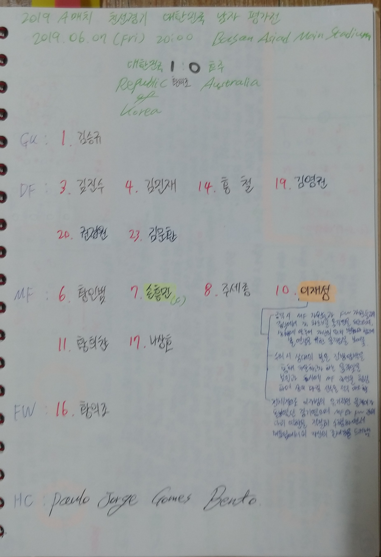 대한민국은 이날 경기에서 여러 전술을 실험하는 자세를 보여주었다. 전반과 후반에 각기 다른 포메이션을 통해 확인할 수 있으며, 선수들의 위치 변화와 움직임의 차이를 통해 큰 틀에서의 변화를 보여주었다. 또한, 벤투 감독은 선수교체를 통해 선수들이 가지고 있는 장점들을 극대화 시킬 수 있는 움직임을 주문하였다. 한 선수 한 선수가 뭉쳐 다른 선수의 강점을 드러내도록 하는 모습이 돋보인 경기였다. 이에 반해, 경기 양상이 어쩌면 지루하게 전개된 점이 아쉬운 부분이다. 전술적 다양성과 그에 따른 여러 실험을 선보였으나, 아직 선수들 간의 손발이 맞지 않음을 확인할 수 있는 경기였다. 따라서, 이번 경기의 키워드는 '다양한 실험', '코너킥 전술' 그리고 '평가'이 세 가지라고 생각한다.