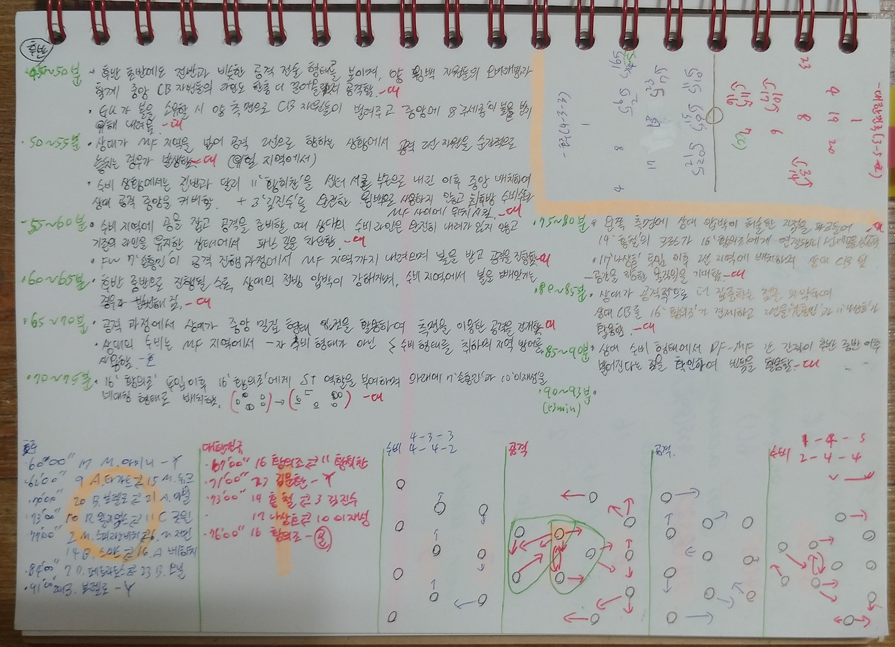 1. 공격 지역에서의 과감한 패스 시도와 공간을 창출하는 움직임이 저조한 경기였음. 상대 배후 공간을 이용하고자 하는 모습, 점과 볼을 받기 위한 움직임 그리고 공간을 향한 패스가 많이 나오지 않은 부분이 가장 아쉬운점임.