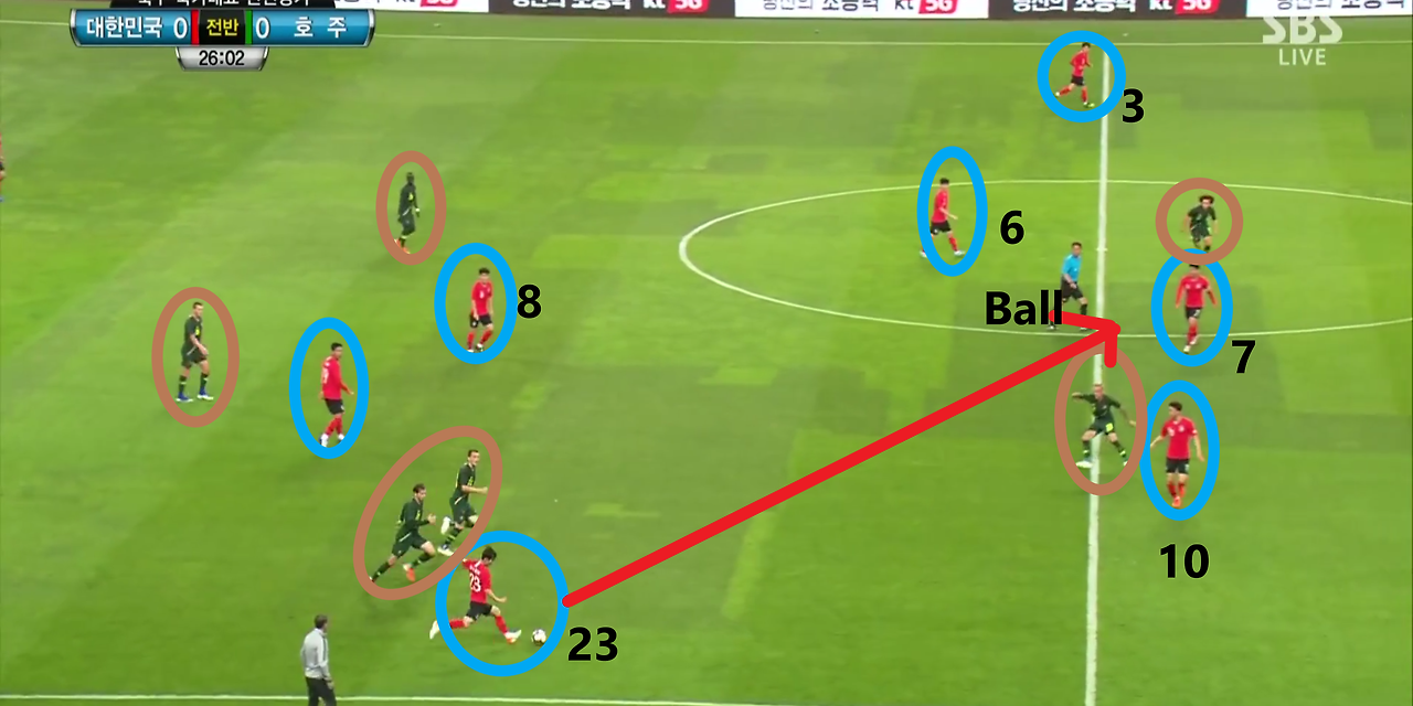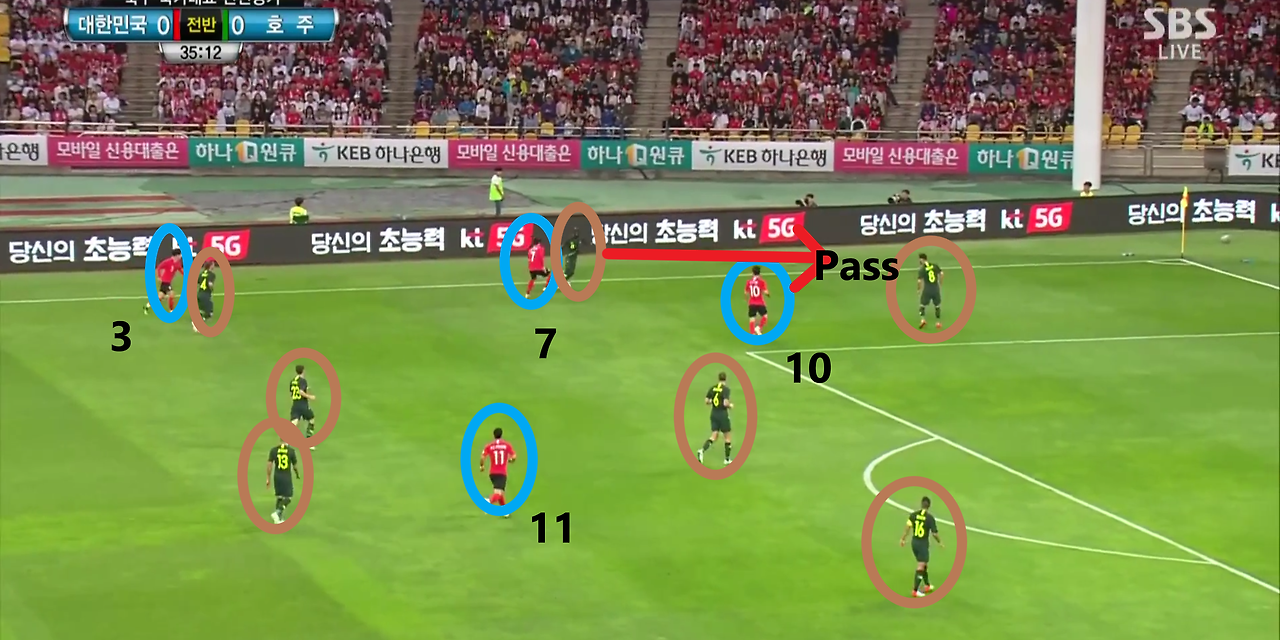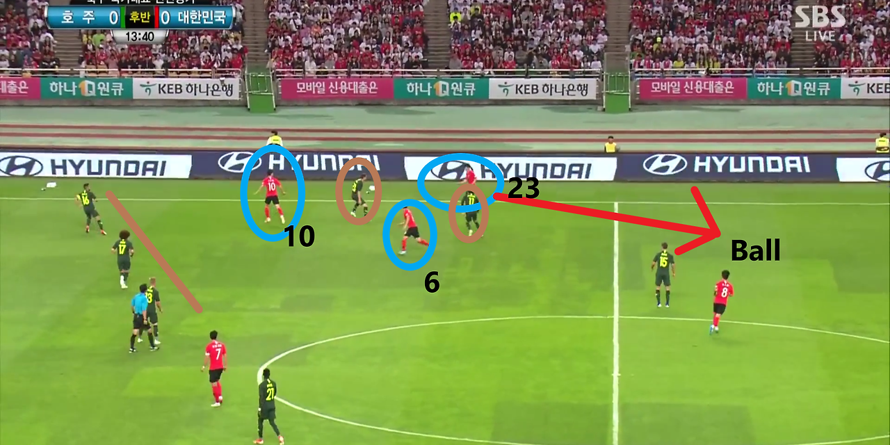 - 상대가 자기 진영에서 볼을 소유하는 상황에서의 전방 압박(Forward-Pressing)을 확인할 수 있는 장면임. 볼을 소유한 선수에게 '손흥민'(7번)이 압박을 가하며, 주변의 선수는 윙백(Wing-back) '김진수'(3번)와 2선 공격수 '이재성'(10번)이 각각 달라붙어 수비함. '손흥민'이 상대가 전방으로 볼을 연결하지 못하도록 수비 각도를 잡아놓은 상태이기에 상대는 어쩔 수 없이 후방으로 볼을 연결함.