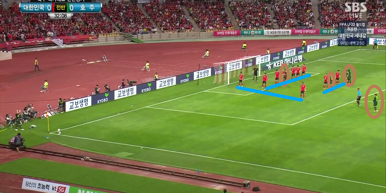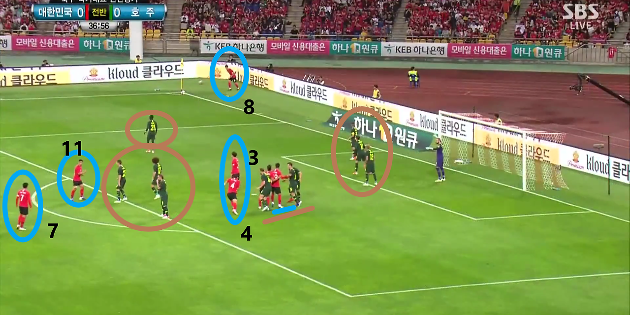 - 상대의 코너킥(Coner-Kick) 상황 시 수비 형태를 확인할 수 있는 장면임. 페널티 박스 내부에 9~10명의 선수를 종으로 2줄 배치함. 골키퍼(GK) 앞선에는 7명의 선수를 배치하고 박스 모서리 주변에는 3명의 선수를 배치함. 박스 내부에 있는 상대 공격 자원들의 높은 제공력을 방해하고자 하는 수비 형태임. 이날 경기에서 대한민국은 매 코너킥 수비 상황에서 이와 같은 형태를 형성함.