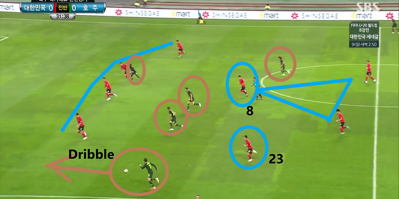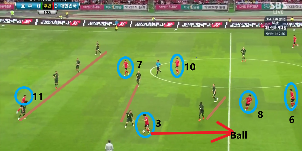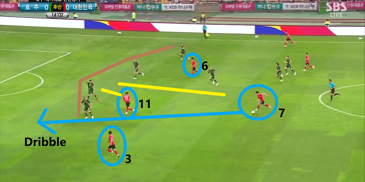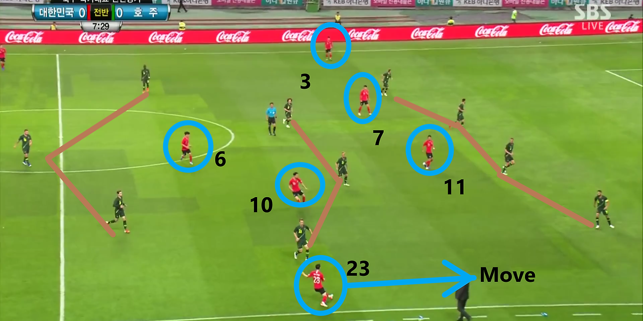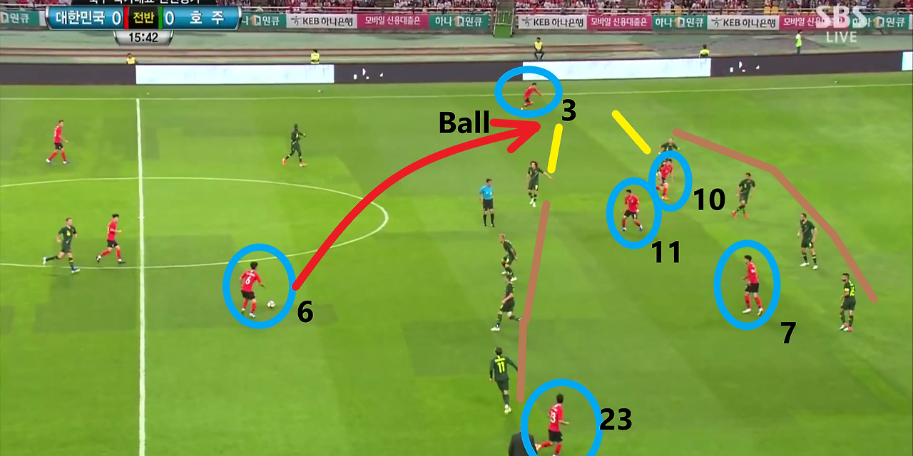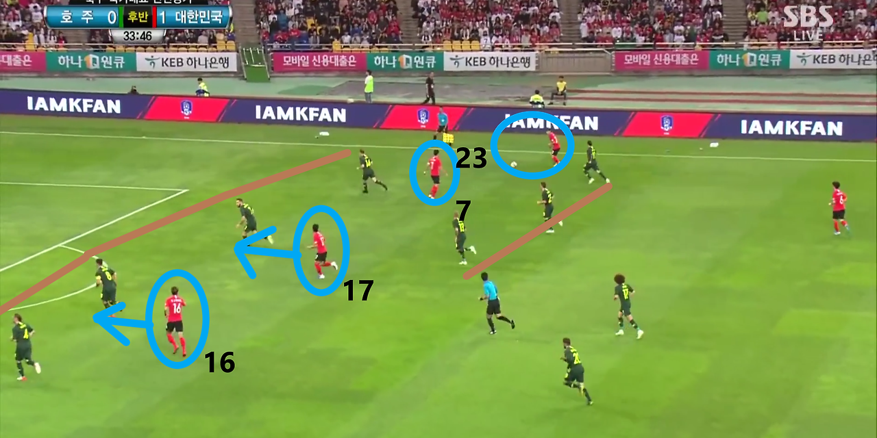 - 우측 윙백(Wing-back) '김문환'(23번)이 볼을 몰고 측면 깊숙한 지역으로 이동하는 장면임. 이때, 상대는 4백(4-Back) 수비라인을 완전히 구축한 상태임. 이러한 상대 수비라인의 불균형을 위해 공격 중앙 지역에서 '황의조'(16번)와 교체 투입된 '나상호'(17번)가 상대 진영 깊숙한 지역으로 접근함. 이러한 움직임을 통해 상대 최후방 수비의 움직임을 방해하고, 공격 2선 지역의 '손흥민'(7번)에게 상대의 압박으로부터 자유로운 공간을 창출하고자함.