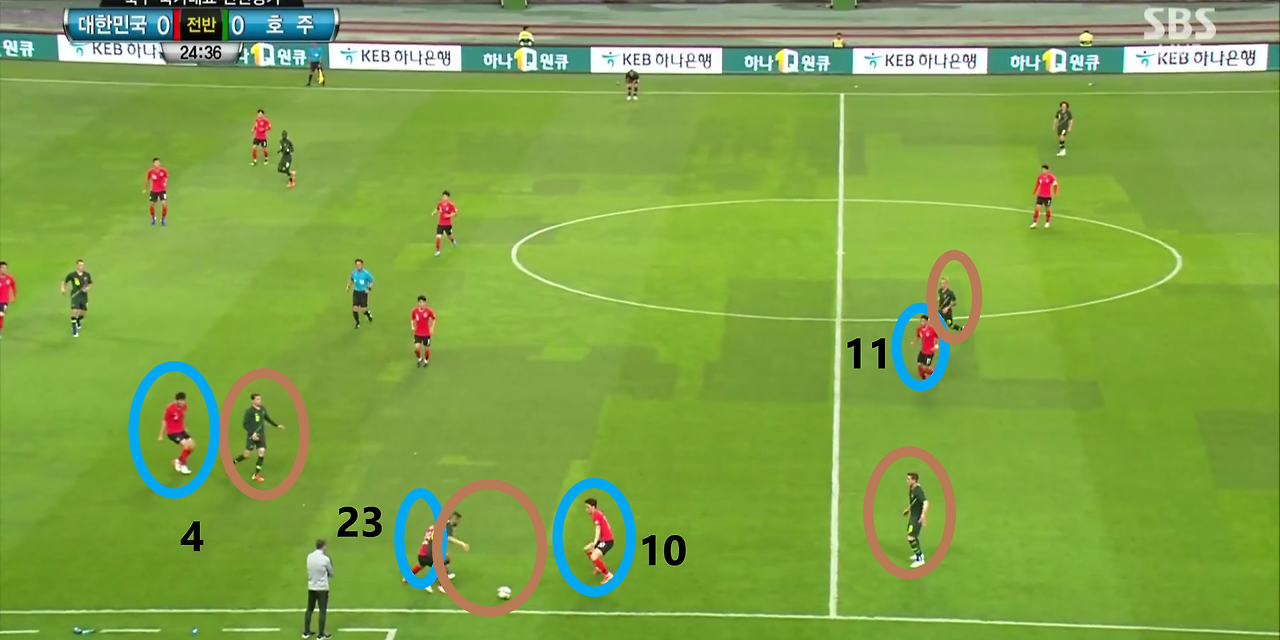 - 상대가 측면을 향한 공격 전개 시 측면 협력 수비를 확인할 수 있는 장면임. 볼을 소유한 선수에게 1차적으로 '김문환'(23번)이 강한 압박을 가하며 후방으로의 패스 길을 끊어내기 위해 위치하던 '이재성'(10번)에게 유인함. 이때, '김민재'(4번)와 '황희찬'(11번)은 주변 오프더볼(Off-the-ball) 선수와의 간격을 줄이며 상대 공격이 원활하게 전개되지 못하도록 함.
