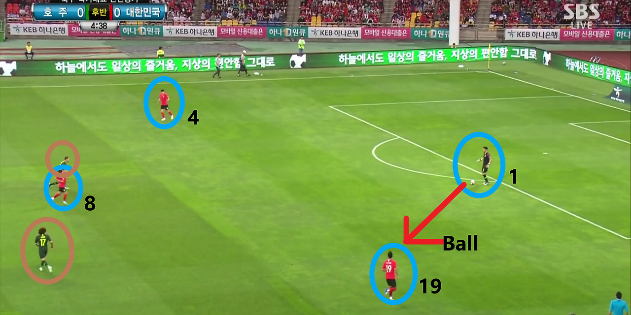 - 골키퍼(GK) '김승규'(1번)에게서 부터 볼이 진행되는 장면임. 중앙 수비수(CB) '김영권'(19번)과 '김민재'(4번)가 좌우 넓은 위치로 이동하고 중앙으로 '주세종'(8번)이 볼을 받기 위해 움직임. 골키퍼(GK)부터 시작되는 빌드업(Build-up) 전개의 과정을 확인할 수 있음.