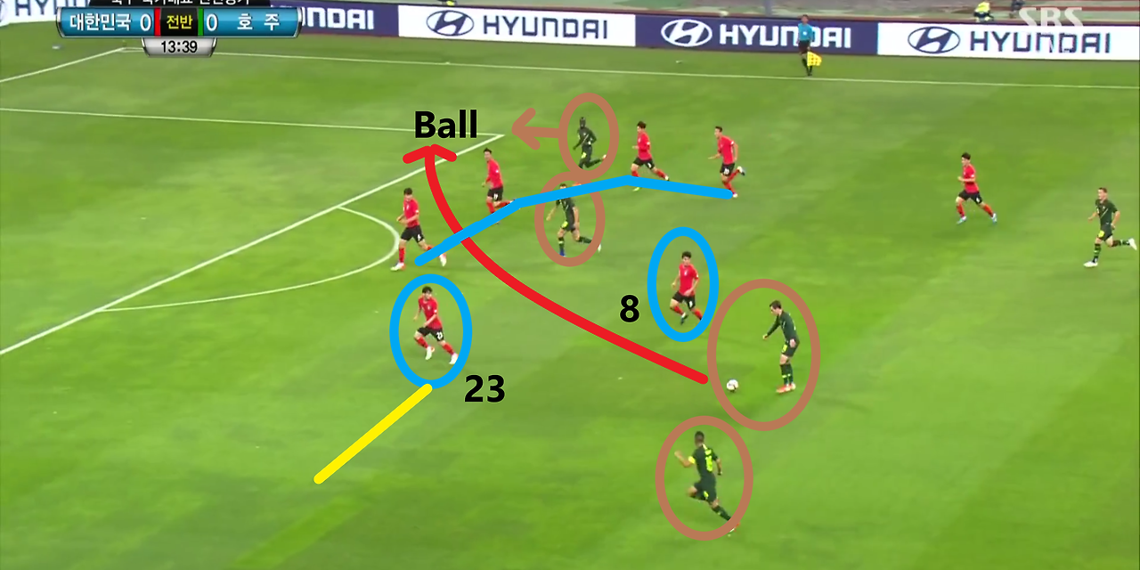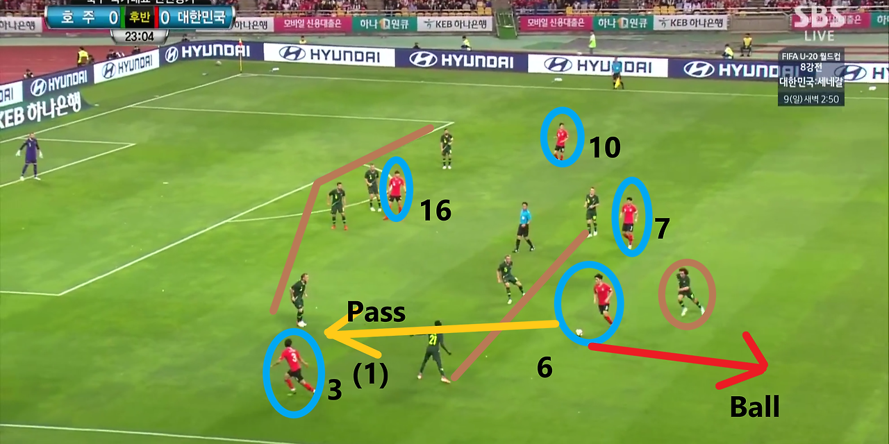 - 상대가 자기 진영에서 부터 측면을 활용한 공격을 전개하고자 하는 과정에서 수비 형태를 파악할 수 있음. 볼을 차단하기 위해 '황인범'(6번)이 볼을 소유한 선수에게 다가가고, 주변의 오프더볼(Off-the-ball) 상황의 선수에게는 측면 수비자원인 '김문환'(23번)이 전진하여 수비함. 하지만, '김문환'의 전진으로 측면에 공간이 발생하는 상황이 벌어지고, 상대는 이 공간을 향해 볼을 전개함.