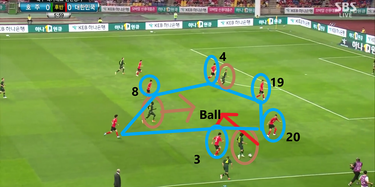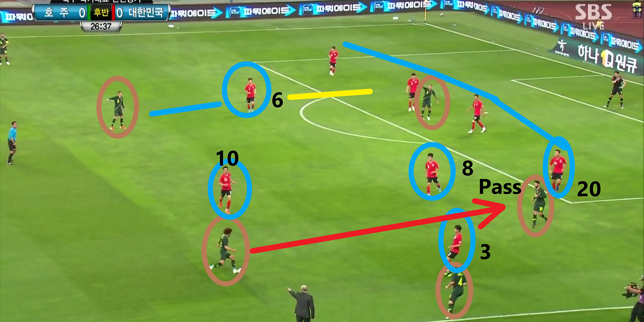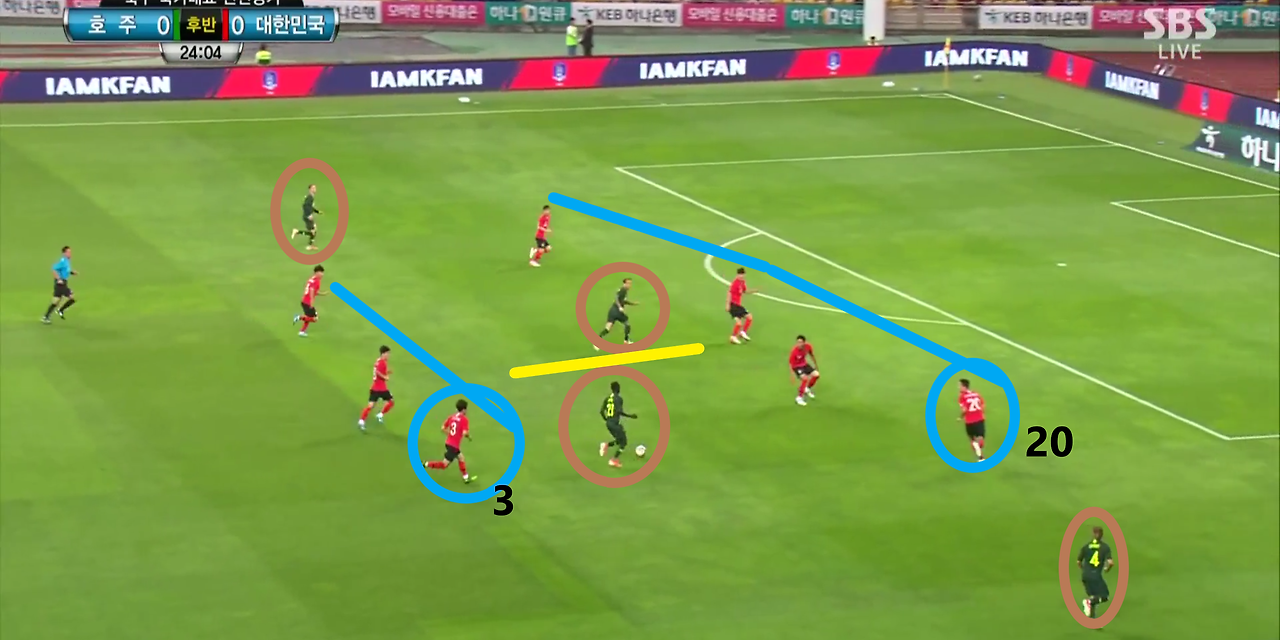 - 상대 공격 2선을 지역을 파고드는 선수를 놓치는 장면임. 상대는 공격 방향 좌측면을 활용하며 전진하고 중앙 수비 비어있는 공간으로 볼을 배급함. 좌측면의 선수에게는 '김진수'(3번)가 압박을 가하고, '권경원'(20번)이 측면으로 돌파하도록 유인하는 수비 자세를 잡음. 상대 최전방 공격수(ST)는 공격 깊은 지역에서 중앙 수비수(CB) '김민재'(4번)와 '김영권'(19번)의 움직임을 견제함. 상대의 이러한 유기적인 움직임이 수비의 형태를 제한하였고, 공격 2선에서의 공간을 창출함.
