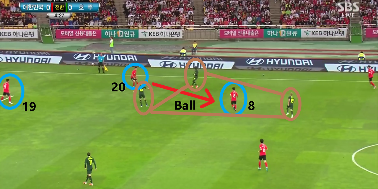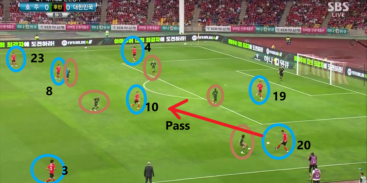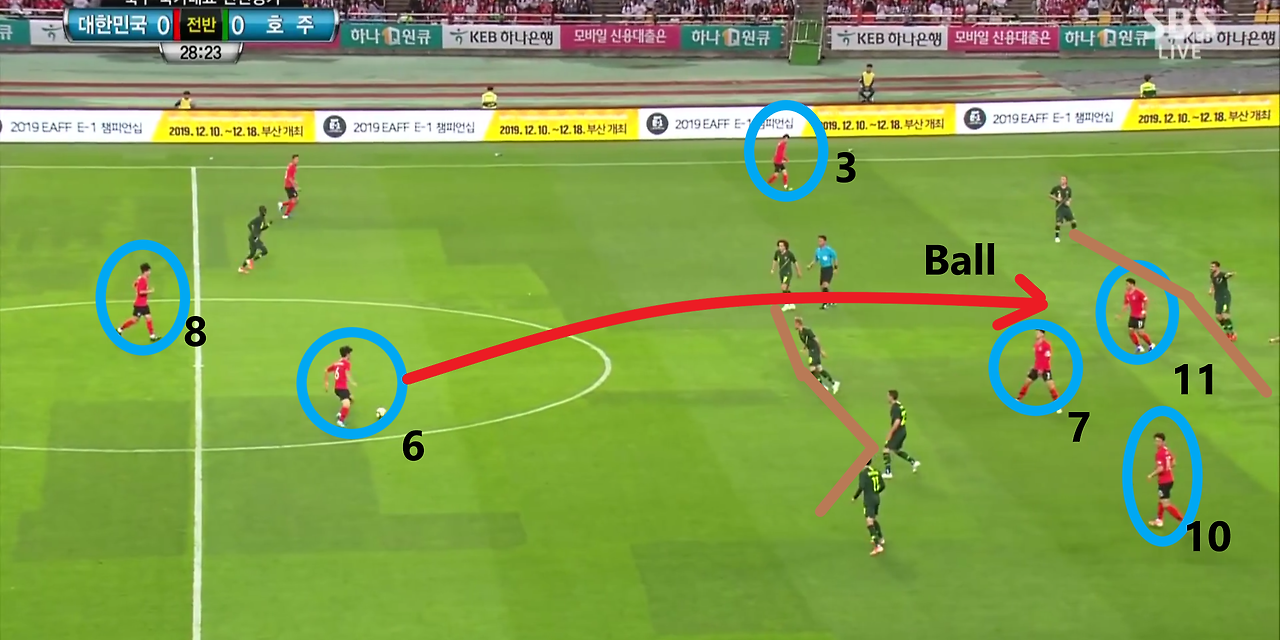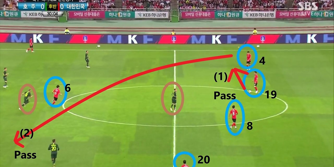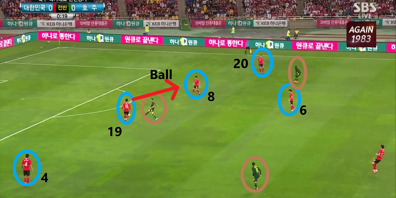 - 경기 초반 빌드업(Build-up) 시작 단계를 보여주는 장면임. 볼란치(Volante) 역할을 맡고있는 '주세종'(8번)이 중앙 수비수(CB) 위치로 내려와 볼을 전개함. 이때, 3백 형태를 취하고 있던 중앙 수비자원들{'김민재'(3번), '김영권'(19번), '권경원'(20번)}은 좌우로 넓게 벌리며 넓은 공격 형태를 구축함.