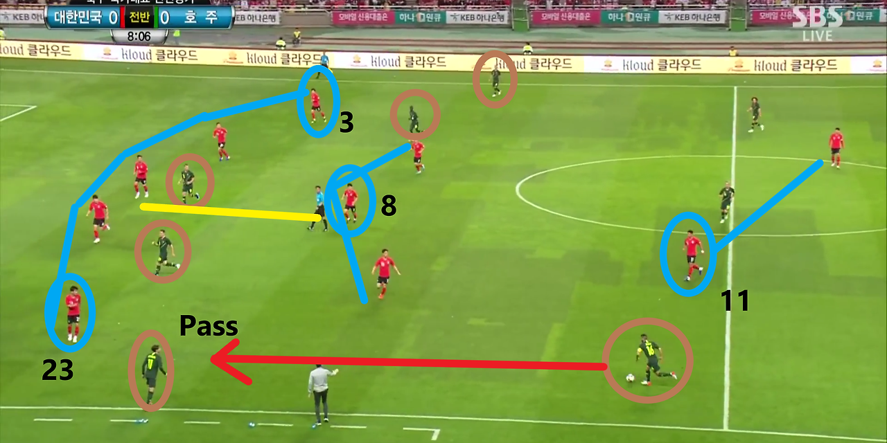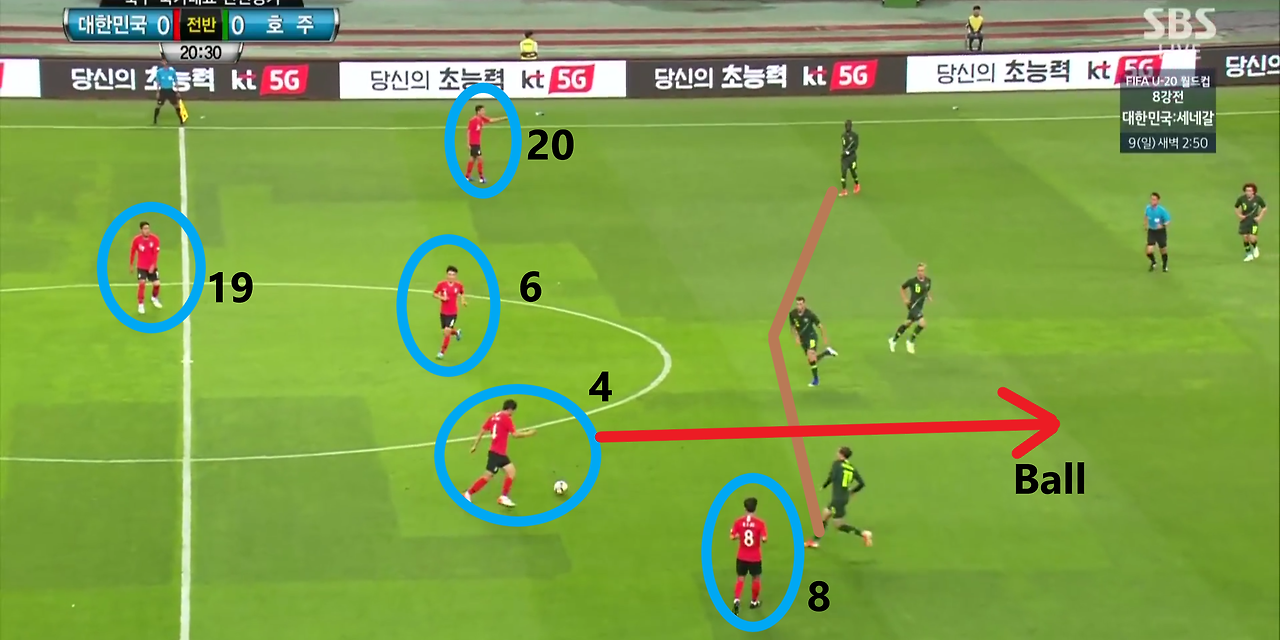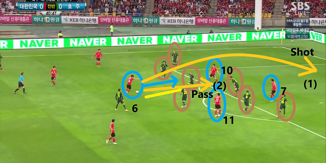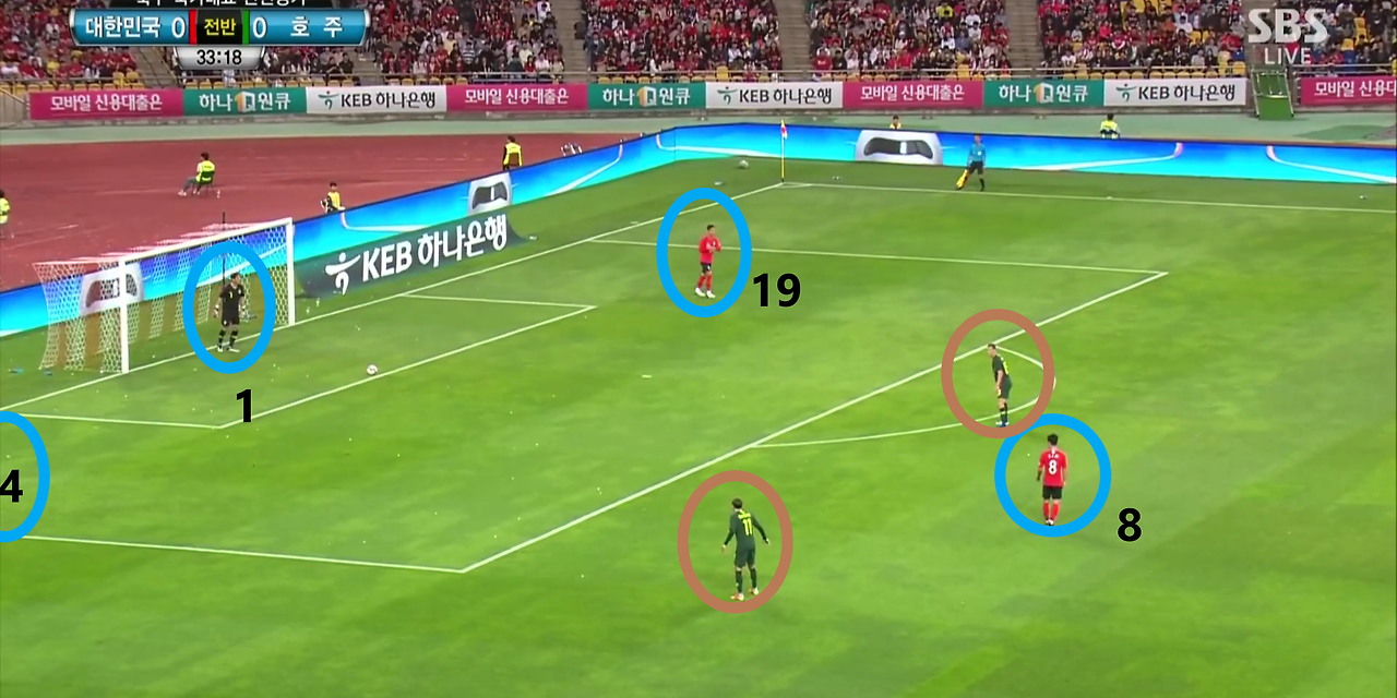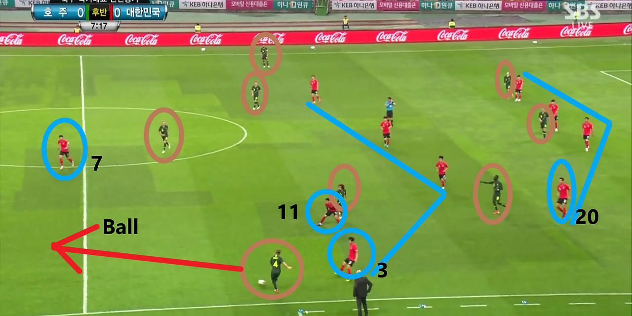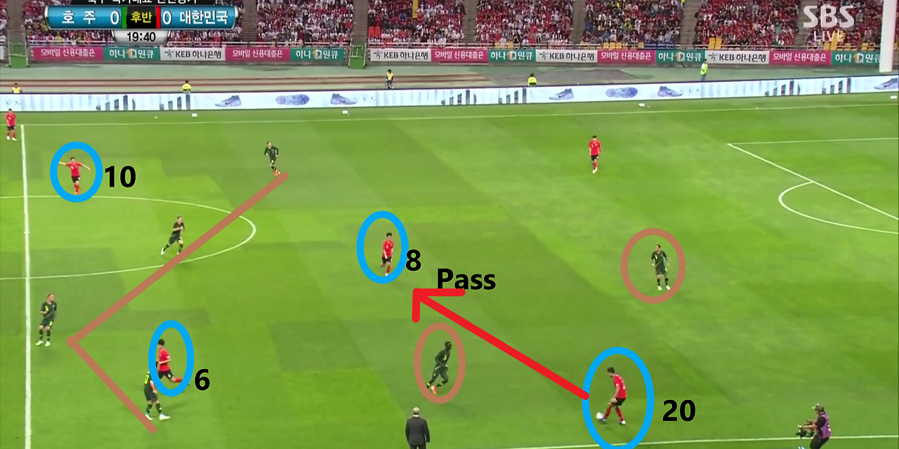 - 경기 초반 빌드업(Build-up) 시작 단계를 보여주는 장면임. 볼란치(Volante) 역할을 맡고있는 '주세종'(8번)이 중앙 수비수(CB) 위치로 내려와 볼을 전개함. 이때, 3백 형태를 취하고 있던 중앙 수비자원들{'김민재'(3번), '김영권'(19번), '권경원'(20번)}은 좌우로 넓게 벌리며 넓은 공격 형태를 구축함.