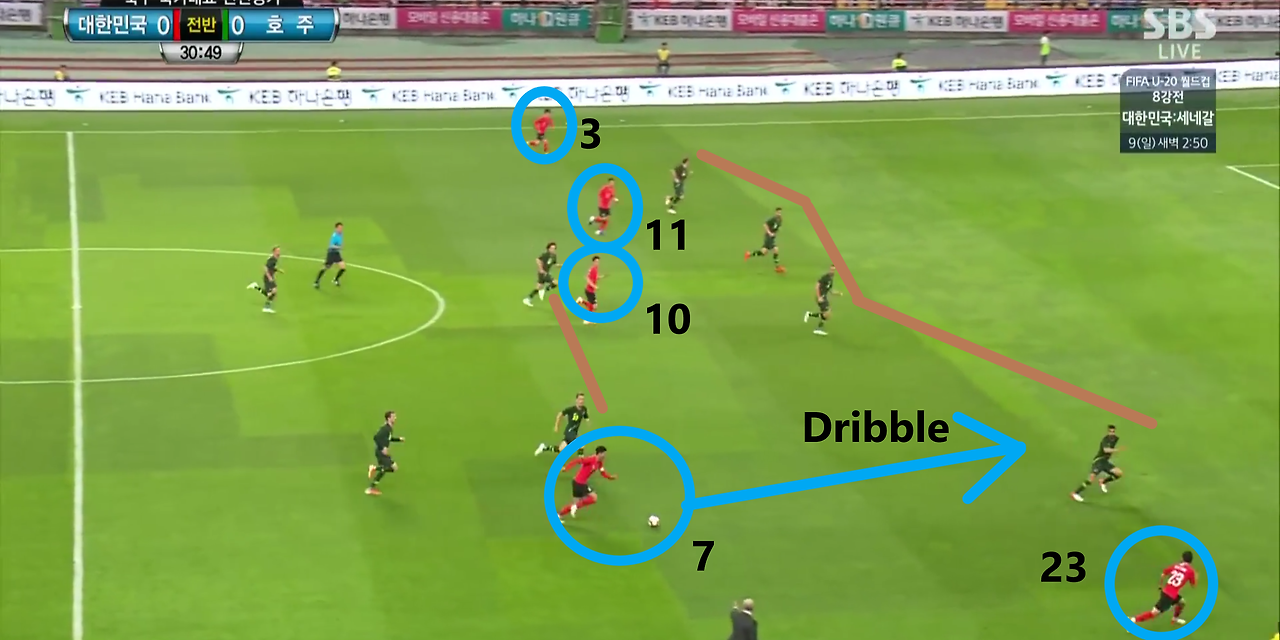 - 상대의 공격 볼을 끊어낸 뒤 곧바로 이어진 공격 기회 장면임. '손흥민'(7번)이 중원에서 볼을 잡고 상대 진영 깊숙한 공간으로 드리블(Dribble)함. 이때, 상대의 최후방 수비수(CB)는 라인을 형성하였으나, 전방에서 '황희찬'(11번)과 '황인범'(6번) 라인이 후방으로 가도록 상대 수비를 유도하는 움직임을 보이며, '손흥민'과의 간격이 점점 멀어지는 것을 확인할 수 있음. 또한, 좌측 윙백(Wing-back) '김진수'(3번)는 빠른 오버래핑(Overlapping)으로 상대 측면 수비수의 시야를 분산시킴.