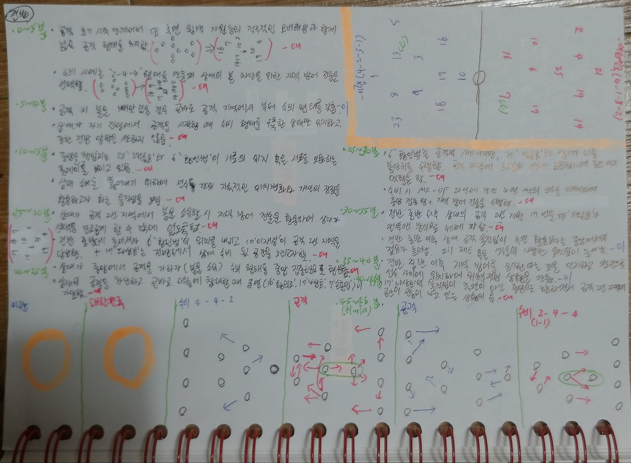 1. 이번 경기에서 가장 아쉬운 부분은 수비 시 전술적 형태의 허점이 노출된 점이라 할 수 있음. 지역 방어를 기반으로 하였기에 상대는 이 수비적 전술의 허점을 파악하고 공격 시 이 점을 공략하며 전개하였기에 가끔 실점 위기 상황에도 직면하였음. 지역 방어 전술 형태와 움직임은 좋으나, 상대가 허점을 찾아내고 이를 활용할 시 다른 수비적 대안을 구축하는 것이 이후 경기에서도 이러한 상황을 대비하는 점이라 생각함.