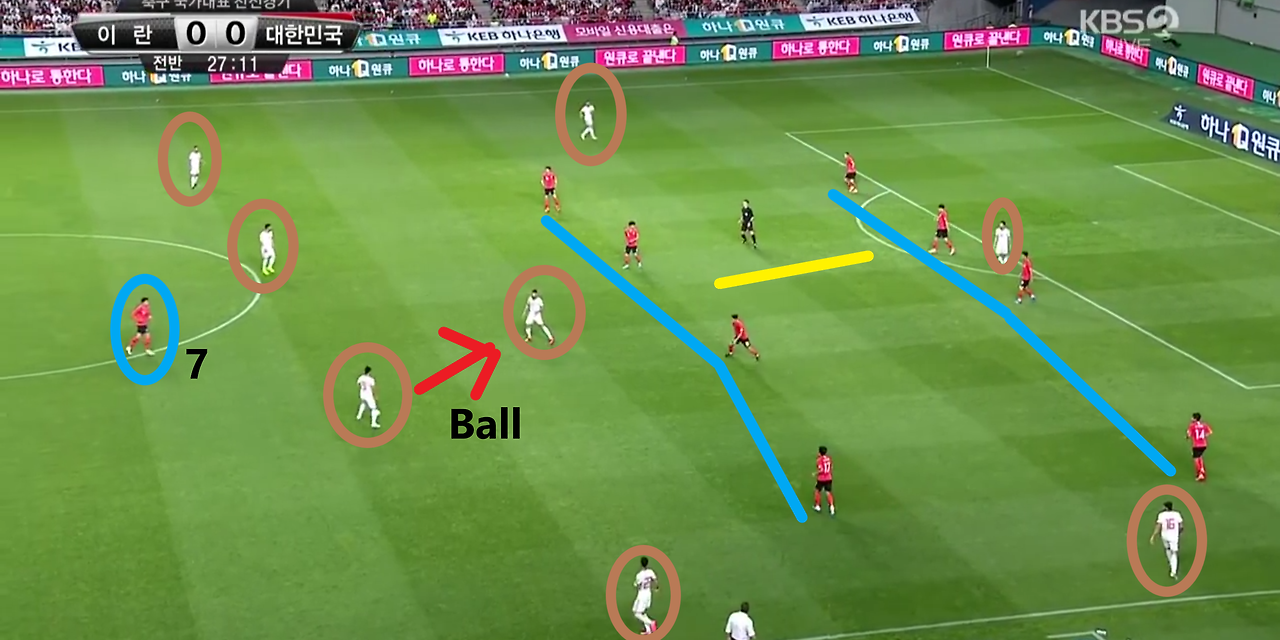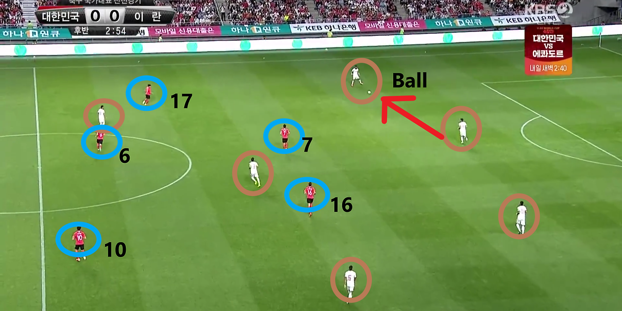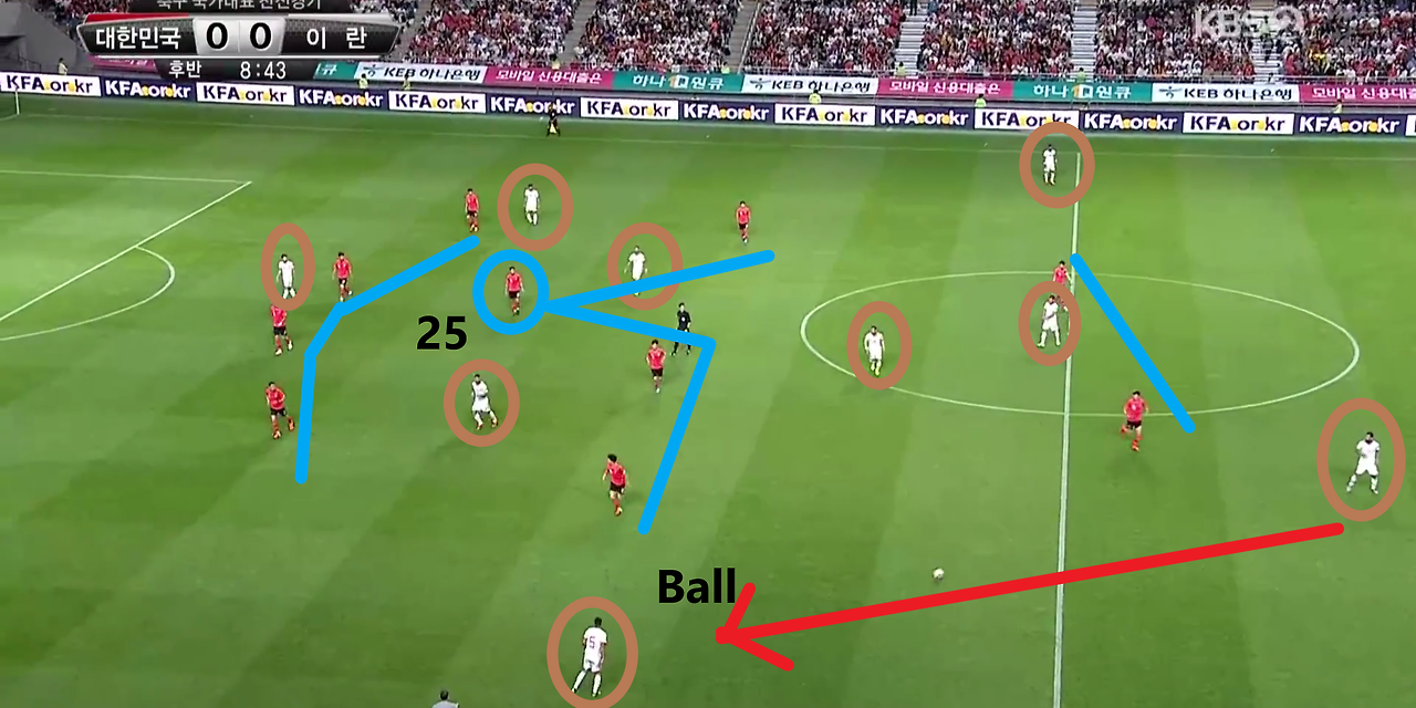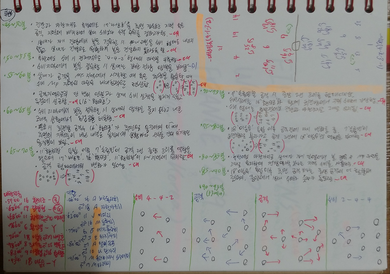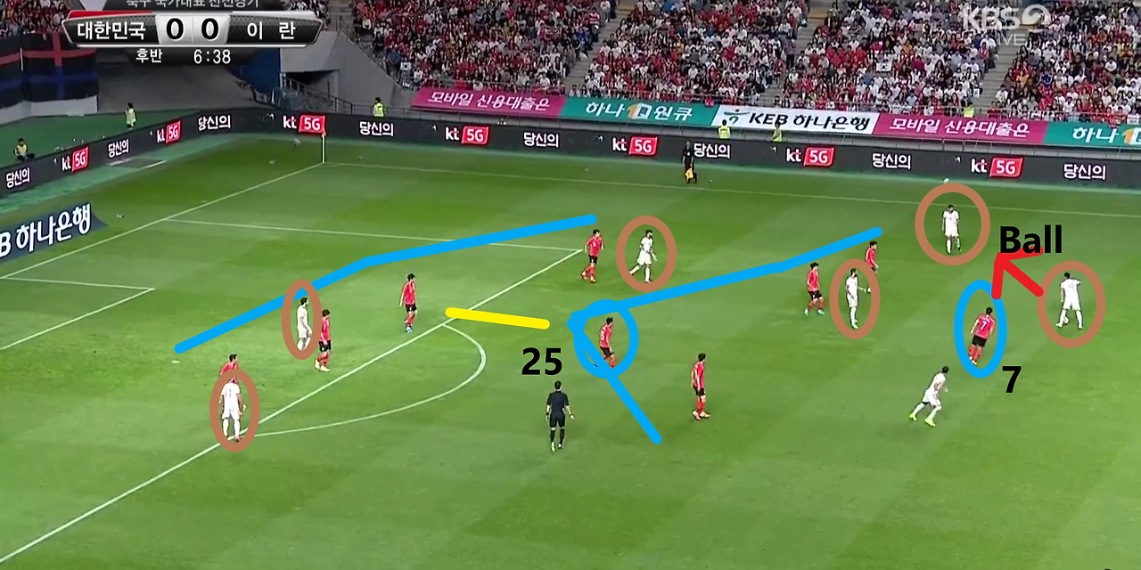 - 후반 시작과 동시에 상대가 자기 진영에서 볼을 점유하는 장면임. 이때, 상대는 좌우 측면으로 넓은 공격 형태를 형성하기 위해 선수를 측면으로 배치함. 이에 맞서는 공격진들은 완전히 수비 형태를 보이거나 적극적인 전방 압박을 시행하지 않고, 미드필더와 공격 라인에서 볼의 전진을 어렵게 하기 위한 지역 방어(Zone-Defence) 형태를 구축함.