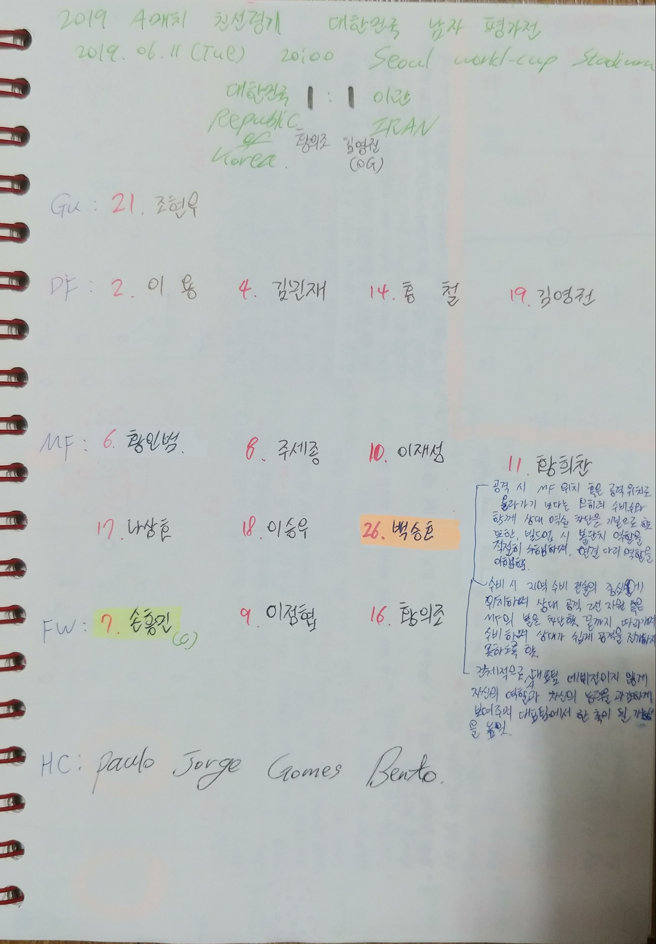 대한민국은 이날 경기에서 적극적인 공격으로 빠른 템포의 경기력을 보여주었다. 선수 개인별로 자신의 강점을 살릴 수 있도록 하는 움직임과 수비지역과 공격지역에서 선수들의 유기적인 라인 컨트롤이 인상적인 경기였다. 또한, 벤투 감독은 상대의 공격에 맞추어 수비의 위치와 움직임을 지정하고, 선수교체를 통해 다양한 공격 전술을 감행하였다. 지난 호주전(06.08)과는 여러 방면으로 차이를 보인 경기였으며, 이번 경기에서 코너킥 공격 전술에 대한 실험은 시도하지 않은 점으로 보아 세트 피스보다는 필드 플레이에 집중한 경기라고 생각한다. 또한, '백승호'(25번) 선수의 데뷔전을 통해 볼란치 역할의 또 다른 자원을 발견한 경기였다. 추가적으로, '백승호'가 안정적인 경기를 할 수 있도록 옆에서 도와준 '황인범'(6번)의 움직임도 눈에 띄었다. 따라서, 이번 경기의 키워드는 '데뷔전', '공격과 수비의 실험' 그리고 '선수교체'이 세 가지라고 생각한다.