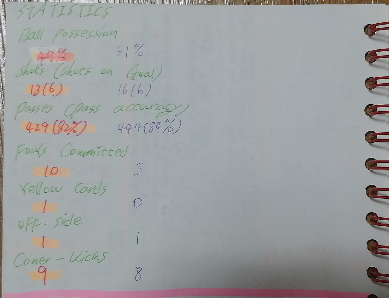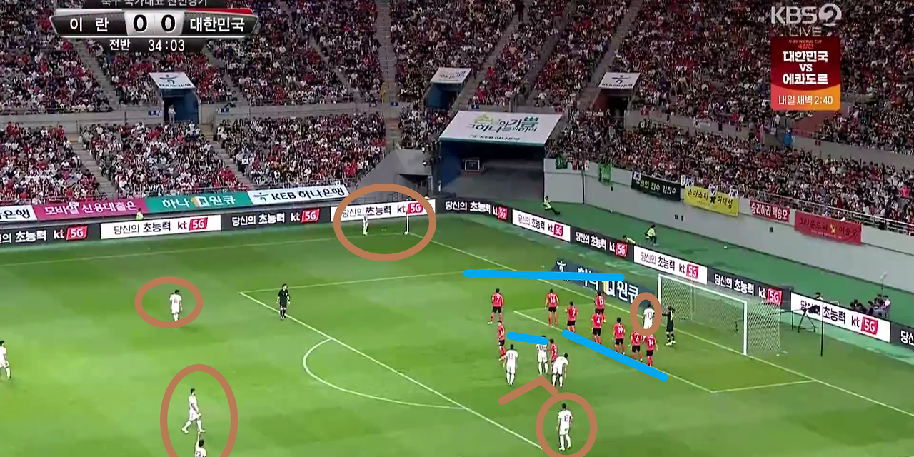 - 상대가 코너킥(Coner) 공격을 얻어낸 상황에서 일어난 수비적 실수와 '김영권'(19번)의 자책골(OG) 장면임. 상대가 코너킥을 준비할 때 골문 바로 앞에 횡과 종으로 열을 세워 지역 수비(Zone-Defence) 전술과 대인 방어(Man-to-man-Defence) 전술을 동시에 활용하고자 함. 하지만, 상대의 키커(Kicker)가 골문 바로 앞쪽으로 킥(Kick)을 하는 순간 페널티(PK) 박스 중앙 지역의 상대 공격진들이 순간적으로 박스 내부로 달려들어 수비 선수들 사이에 배치됨. 이 상황에서 상대 공격 자원이 흘린 볼이 수비수 '김영권'(19번)의 발에 맡고 그대로 득점으로 인정됨. 상대의 공격진을 마크하기 위해 두 수비 전술을 함께 활용하였지만, 아쉬운 결과로 이어진 상황임. 하지만, 매번 러한 수비 전술이 상대의 코너킥을 무산시켰었기에, 수비 형태에서의 문제점은 없다고 생각함.