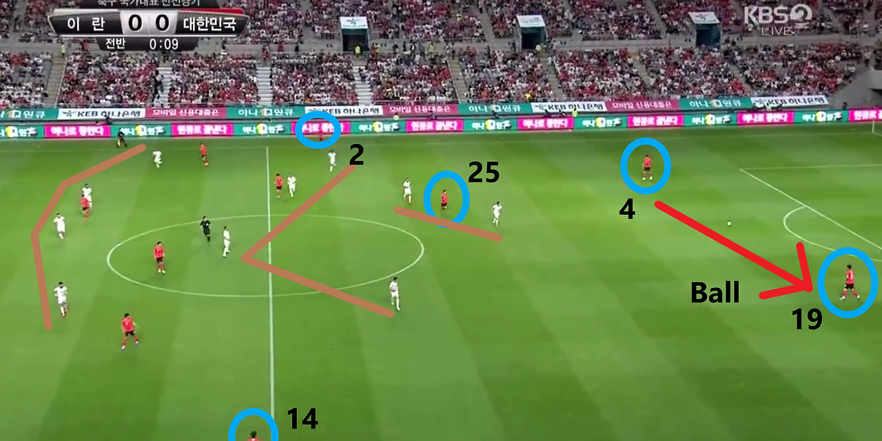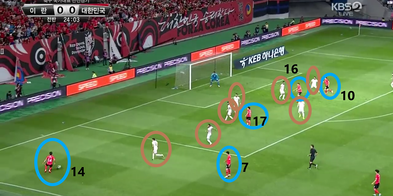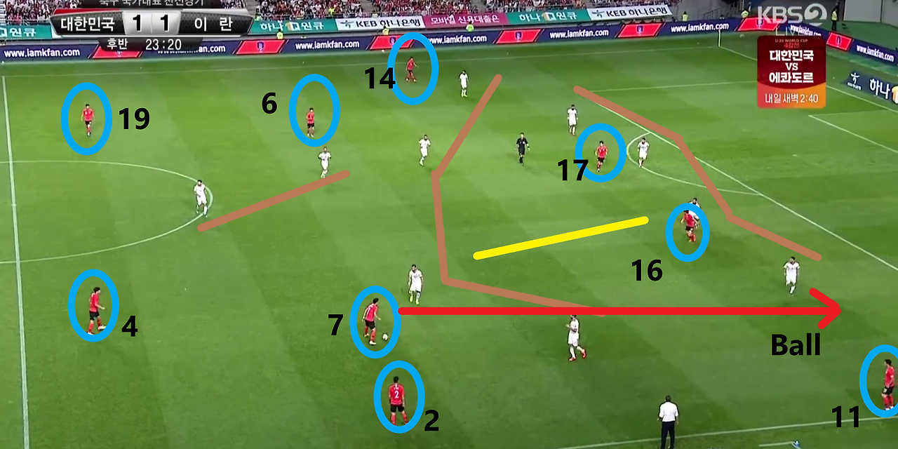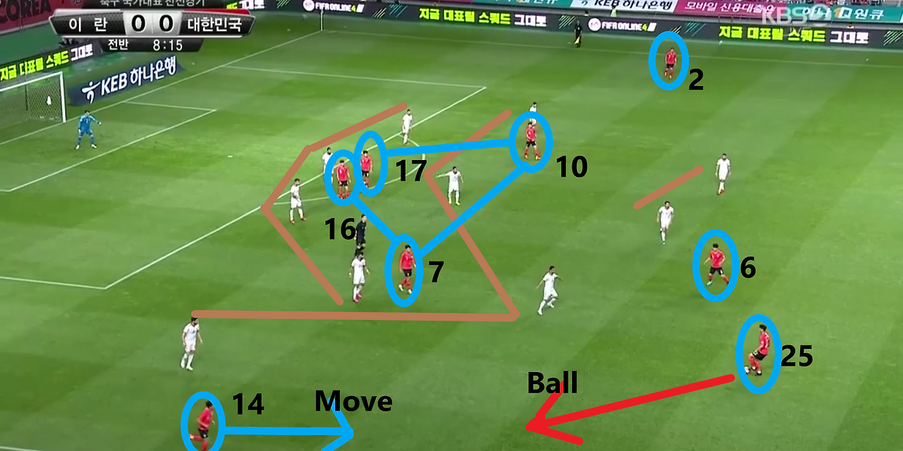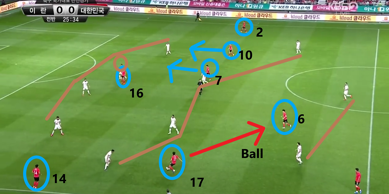 - 양측면 풀백(Full-back) 자원들의 적극적인 오버래핑(Overlapping)과 함께 전체적으로 라인을 올려 공격적인 모습을 취하고 있는 장면임. 볼란치(Volante) '백승호'(25번)가 전방의 '황인범'(6번)과의 동일 선상까지 올라온 상황임. 이 장면에서 가장 눈에 띄는 장면은 공격 중앙에서 선수들의 위치임. '황의조'(16번)와 '나상호'(17번)가 공격 중앙에 위치하며, 공격 2선 지역에는 '손흥민'(7번)과 '이재성'(10번)이 위치함. 이때, 이 선수들 간의 간격이 조밀하기에, 상대의 수비도 중앙 집중형 수비 형태를 보임.