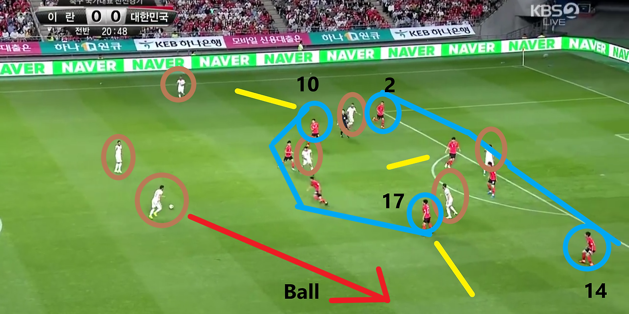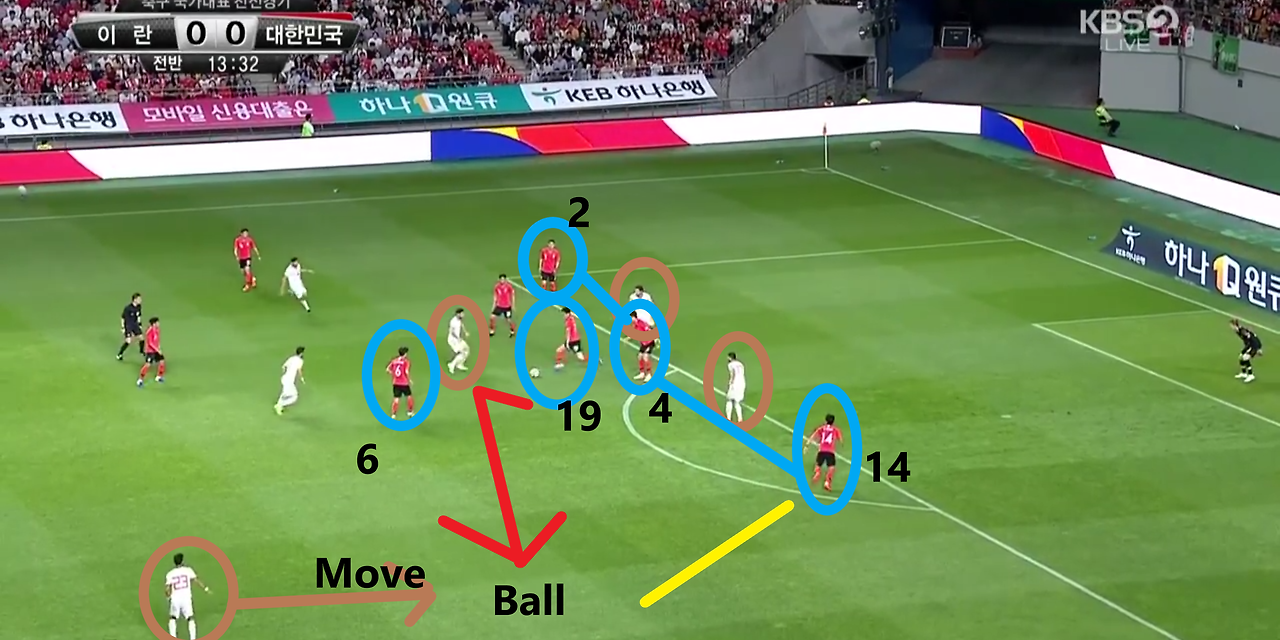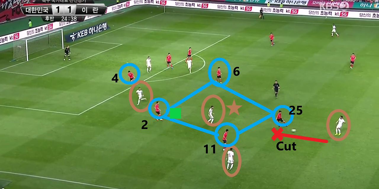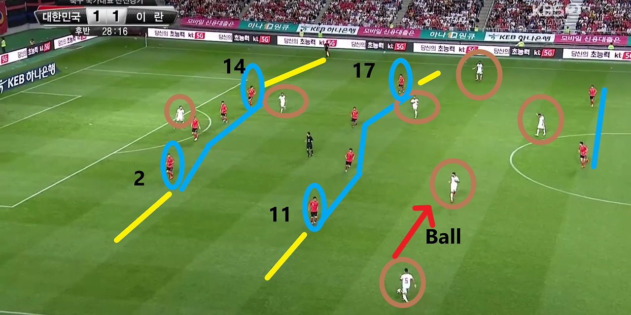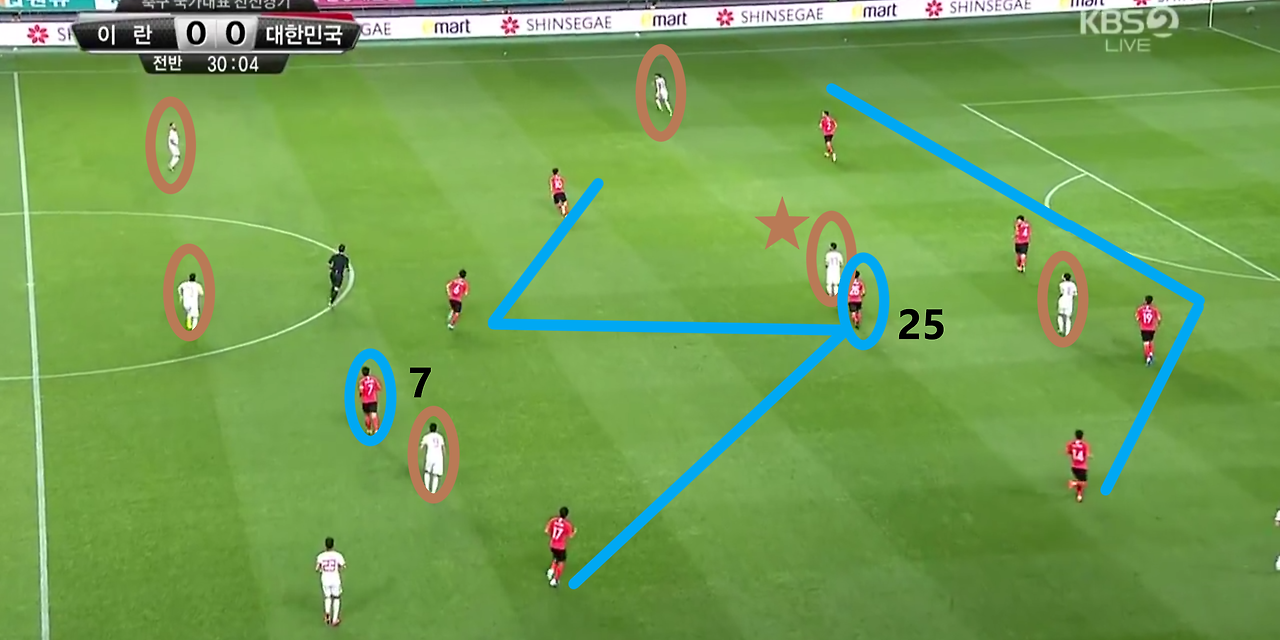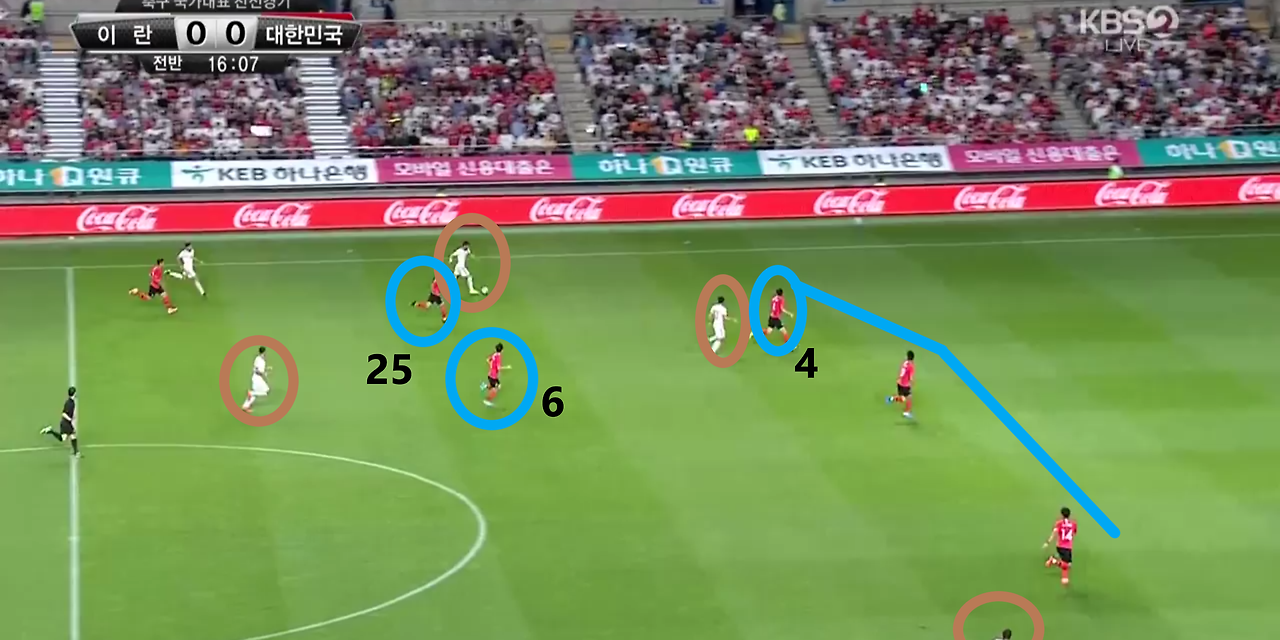 - 양측면 풀백(Full-back) 자원들의 적극적인 오버래핑(Overlapping)과 함께 전체적으로 라인을 올려 공격적인 모습을 취하고 있는 장면임. 볼란치(Volante) '백승호'(25번)가 전방의 '황인범'(6번)과의 동일 선상까지 올라온 상황임. 이 장면에서 가장 눈에 띄는 장면은 공격 중앙에서 선수들의 위치임. '황의조'(16번)와 '나상호'(17번)가 공격 중앙에 위치하며, 공격 2선 지역에는 '손흥민'(7번)과 '이재성'(10번)이 위치함. 이때, 이 선수들 간의 간격이 조밀하기에, 상대의 수비도 중앙 집중형 수비 형태를 보임.