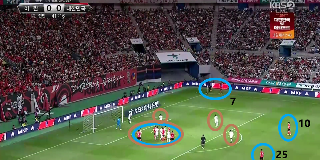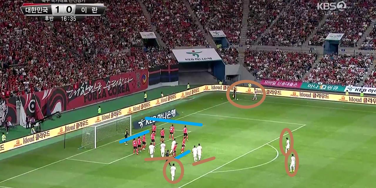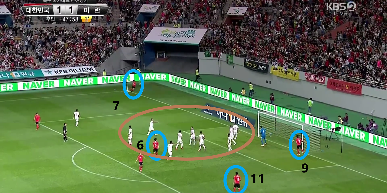 - 코너킥(Coner) 공격 장면임. 키커(Kicker) '손흥민'(7번)이 킥(Kick)을 차기 전 페널티(PK) 박스 내부에는 공격 자원들이 뭉쳐져 있는 형태를 보임. '손흥민'이 킥(Kick)을 할 시 곧바로 흩어지며 골문 앞 다양한 공간으로 위치함. 또한, 박스 외부에는 '이재성'(10번)과 '백승호'(25번)가 위치하며, 세컨드볼(Second-Ball)을 기대함.