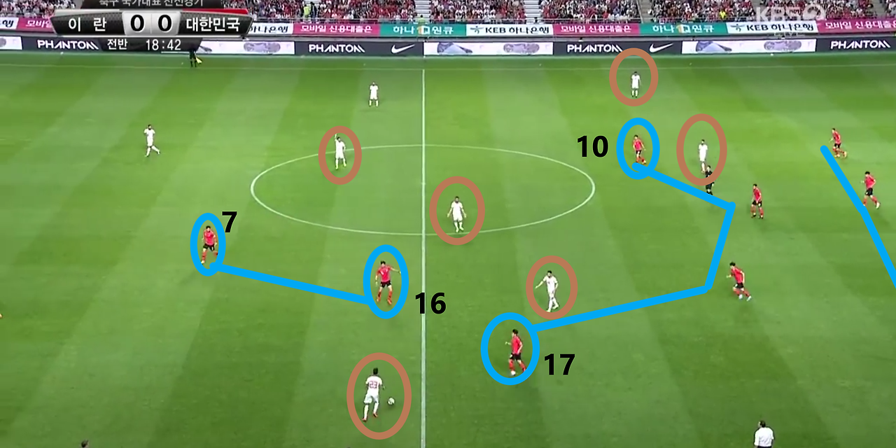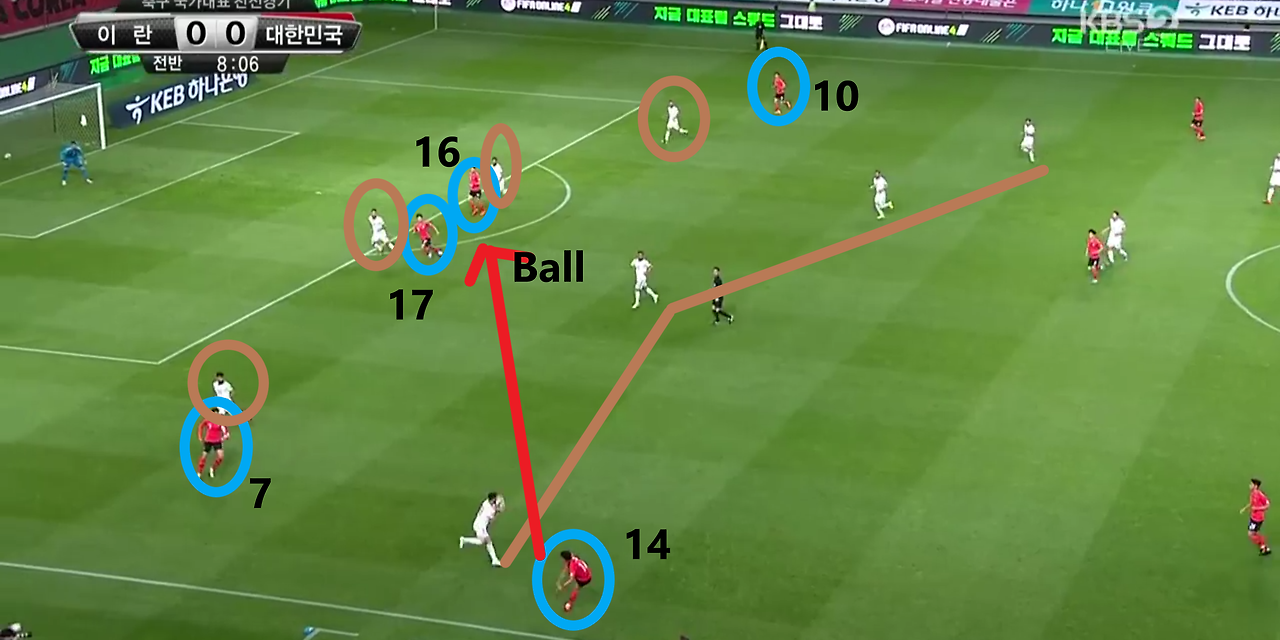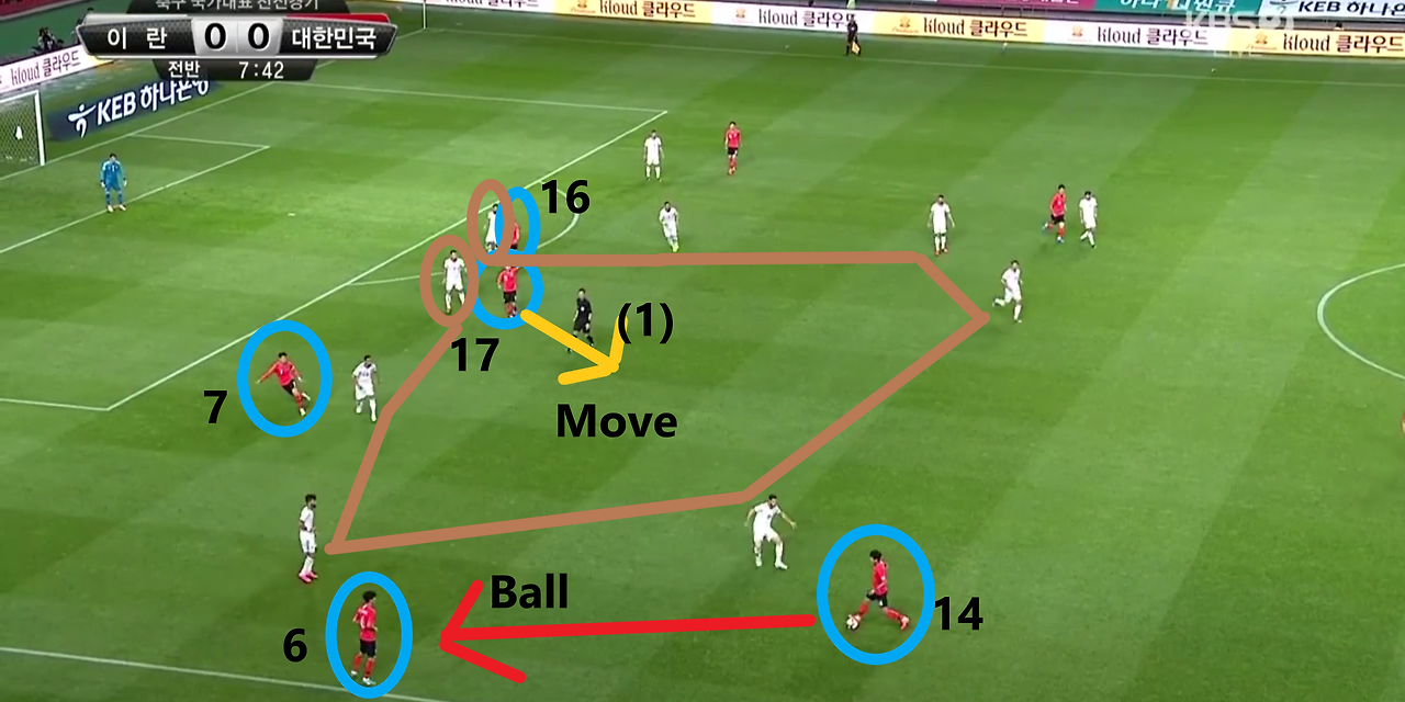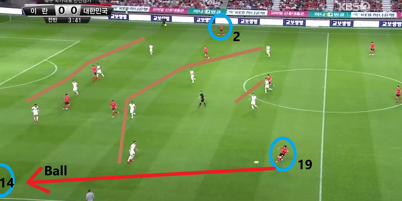 - 측면에서 공격 중앙으로 볼을 배급하는 장면임. 전체적인 형태는 위 장면과 동일함. 좌측 풀백(Full-back) '홍철'(14번)이 좌측에서 볼을 소유할 시 공격 측면에는 각각 '이재성'(10번)과 '손흥민'(7번)이 넓은 공격 형태를 갖추며 상대 최후방 수비 자원들의 측면으로의 이동을 유도함. 또한, 공격 중앙에서는 '황의조'(16번)와 '나상호'(17번)가 상대 중앙 수비수들의 움직임을 제한하고 있기에, 상대 수비 선수 간 간격이 허술해짐을 확인할 수 있음. 이를 노리며 '홍철'이 전방의 '황의조'에게 볼을 전달하는 상황임.