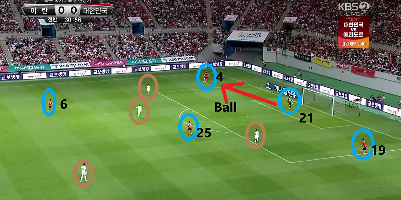 - 골키퍼(GK) '조현우'(21번)가 볼을 전개하는 과정에서 수비수들의 위치를 확인할 수 있는 장면임. 중앙 수비수(CB) '김민재'(4번)와 '김영권'(19번)이 좌우 넓은 위치로 이동하며 볼을 받고자 함. 또한, 볼란치(Volante) '백승호'(25번)는 수비 중앙 위치로 이동하며 '조현우'에게 더 많은 선택지를 제공함. 이때, 상대 공격진들은 전방에 수비 위치를 설정함.