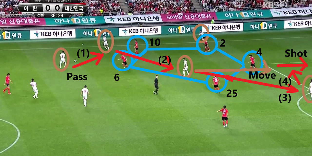 - 상대가 수비적 허점을 파악하고 위치 선정과 빠른 패스(Pass) 전개와 움직임(Move)을 통해 슈팅(Shot)까지 시도하는 장면임. 상대는 수비 전술이 지역 수비(Zone-Defence)임을 파악하여 공격 2선(별표친 선수)과 최전방 지역을 담당하는 선수를 수비 혹은 미드필더 선수들의 사이에 배치함. 또한, 측면 자원들을 측면 넓은 공간으로 배치하여 수비가 측면 선수에게로 시선을 분산시킬 수 있도록 유도함. 이러한 움직임을 통해 미드필더(MF) 지역에서부터의 순간적인 패스와 움직임으로 슈팅을 시도함.