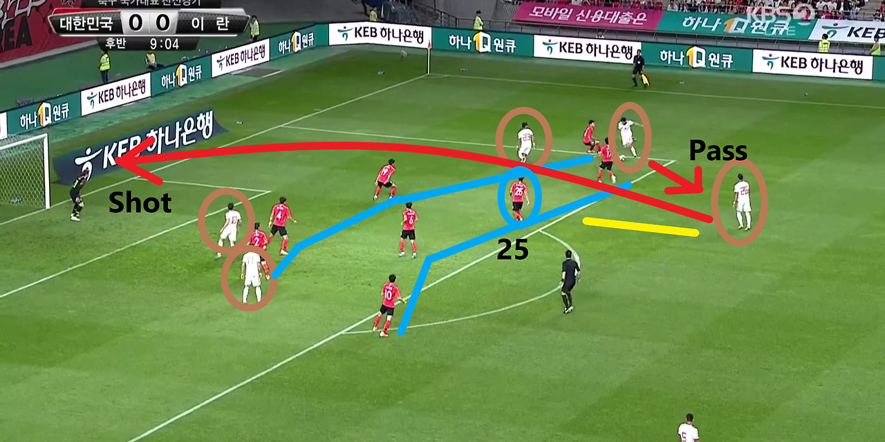 - 상대가 공격 방향 우측면을 통해 공격한 뒤 공격 2선 자원에게 볼을 내어주고 지체없이 슈팅을 시도하는 장면임. 수비진은 수비와 미드필더 각각 4명씩 구성되어 있으며, 상대의 크로스(Cross) 공격에 대비하여 페널티(PK) 박스 내부에서 좁은 간격을 형성함. 하지만, 상대는 공격 2선 지역에 수비의 압박 없이 자유로운 상태의 선수에게 볼을 내어줌. 이때, 슈팅한 선수와 가장 가까이에 있던 선수는 '백승호'(25번)인데 상대 공격진의 위치를 파악하고 시선을 박스 외부에 두어 곧바로 압박을 가했다면 슈팅 기회를 내주지 않았을까 생각함.