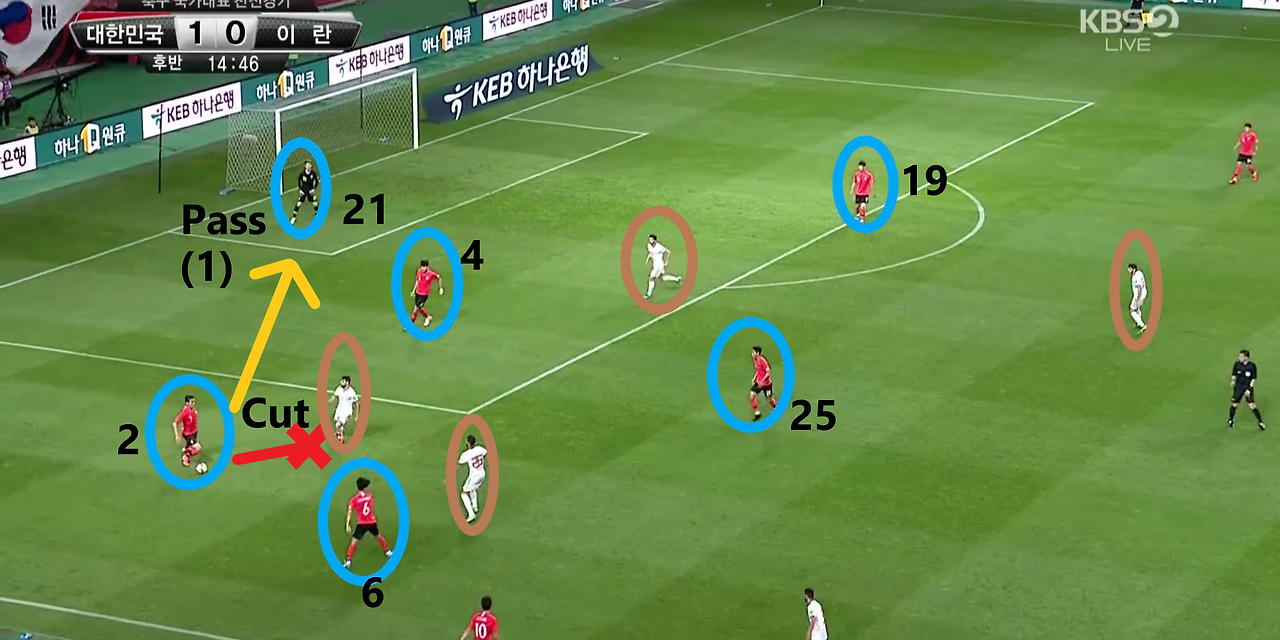 - 경기 초반 수비 지역에서부터의 빌드업(Build-up) 과정을 보여주는 장면임. 먼저, 양측 풀백(Full-back) '이용'(2번)과 '홍철'(14번)이 미드필더(MF) 라인까지 올라가며 오버래핑(Overlapping)함. 또한, 볼란치(Volante) 역할의 '백승호'(25번)는 중앙 수비수{'김민재'(4번), '김영권'(19번)}간의 패스플레이에 가담하기 위해 수비 지역으로 내려옴. 이때, 상대는 전체적으로 '4-4-2' 수비 형태를 선택함.