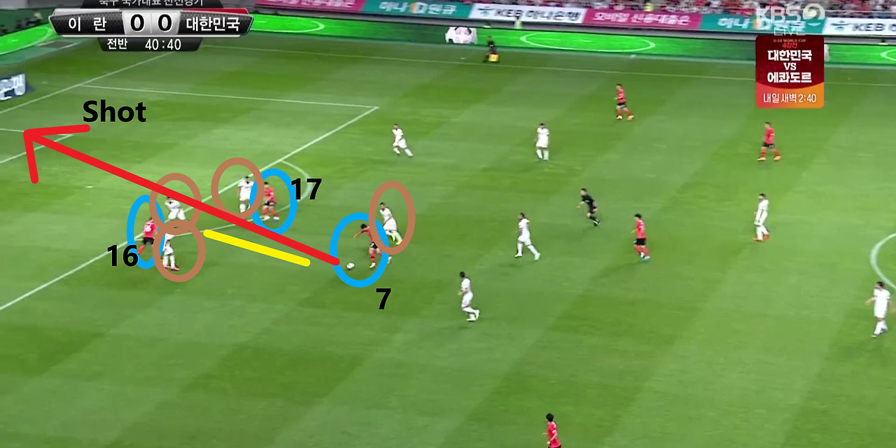 - 상대가 공격하는 볼을 끊고 곧바로 역습을 전개한 이후 '손흥민'(7번)이 공격 2선 지역에서 슈팅(Shot)을 시도하는 장면임. 상대의 중앙 수비수(CB)의 주변에 '황의조'(16번)와 '나상호'(17번)가 위치하여 수비의 움직임을 제한하였기에, 공격 2선 지역에서 '손흥민'이 자유롭게 슈팅을 시도할 수 있는 공간이 창출됨.