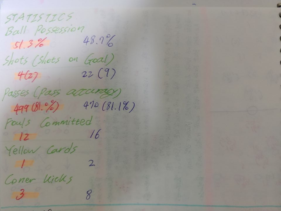 - 상대보다 높은 볼 점유율을 보이면서 높은 패스 횟수와 성공률을 보여준 것으로 미루어 보아 선수들의 유기적인 움직임과 지속적인 패싱이 좋은 경기력을 보여준 기반이라 생각함.