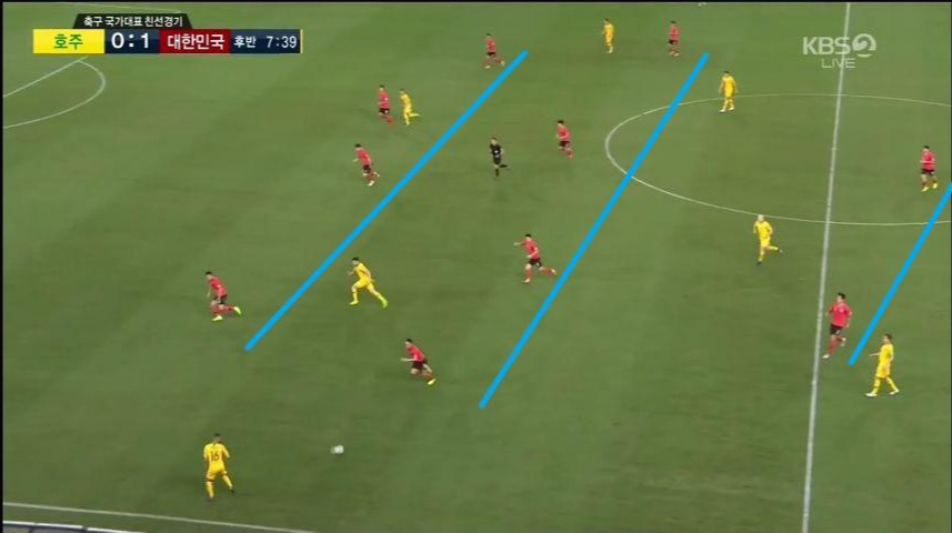 - 상대의 공격 전개 방향이 주로 중앙으로 이어지는 것을 파악하여 측면 보다는 중앙으로 선수간 그리고 수비(DF)와 미드필더(MF)간 라인 간격을 좁은 형태로 유지함.