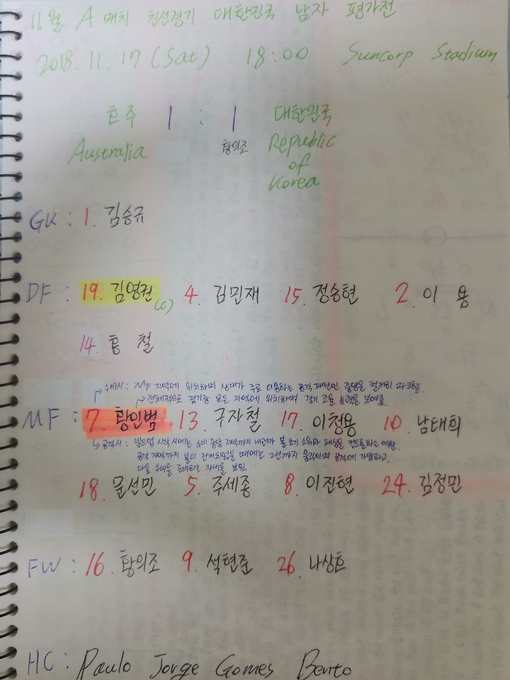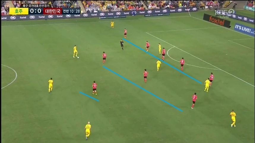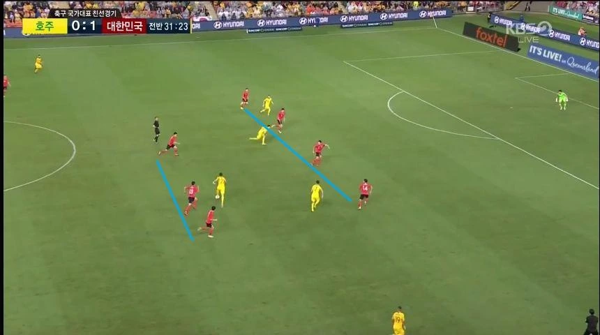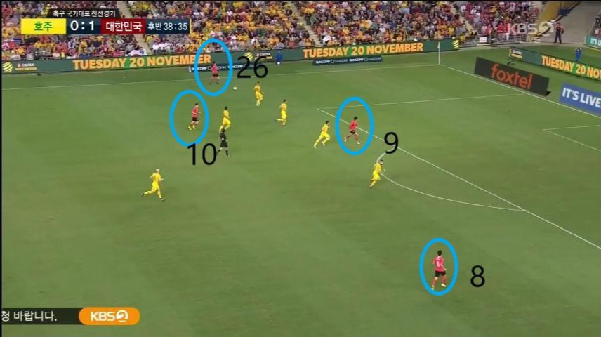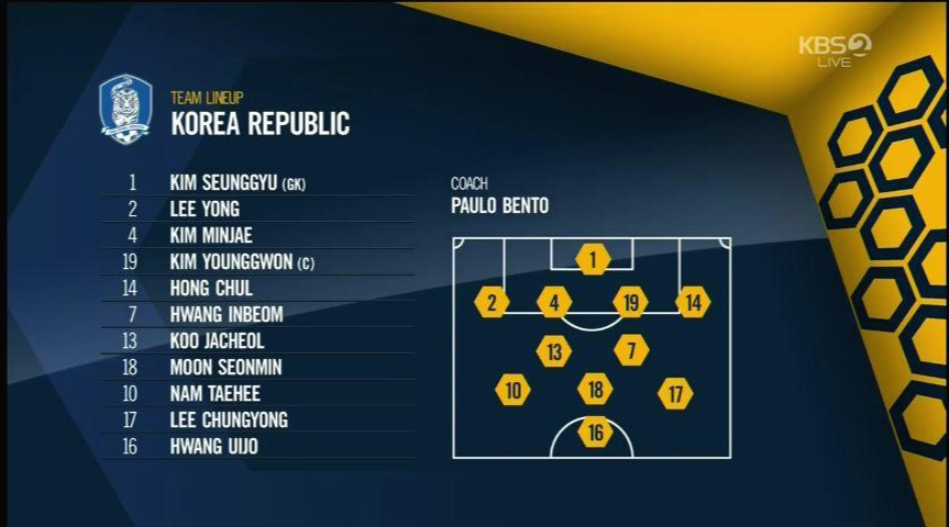 - '이청용'(17번)과 '이진현'(8번)을 교체하면서 '나상호'(26번)가 좀 더 전진된 위치에서 자신의 주 특기인 측면을 이용한 공격을 전개함.
