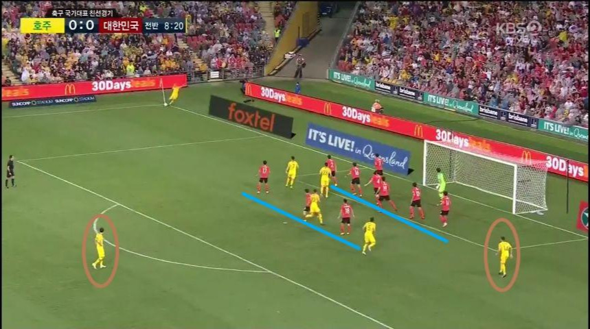 - 상대의 코너킥 상황 시 대한민국 수비는 두 라인을 형성하며 PK박스 내부에 몰린 상대 선수들을 대인 및 지역 마크하는 모습을 보임. 하지만, 선수가 밀집해 있는 공간 뒤 쪽과 PK박스 밖에서 세컨드 볼(Second Ball)을 기다리는 선수는 견제하는 모습이 보이지 않음.