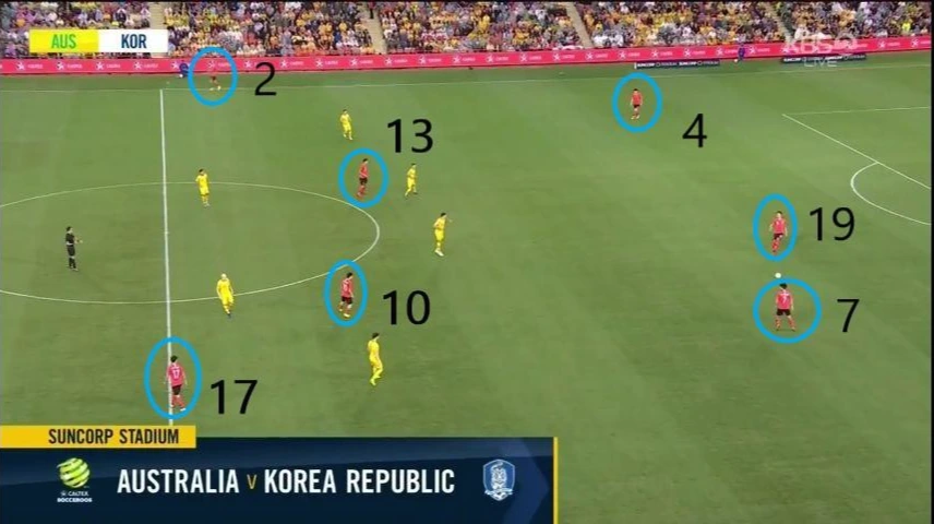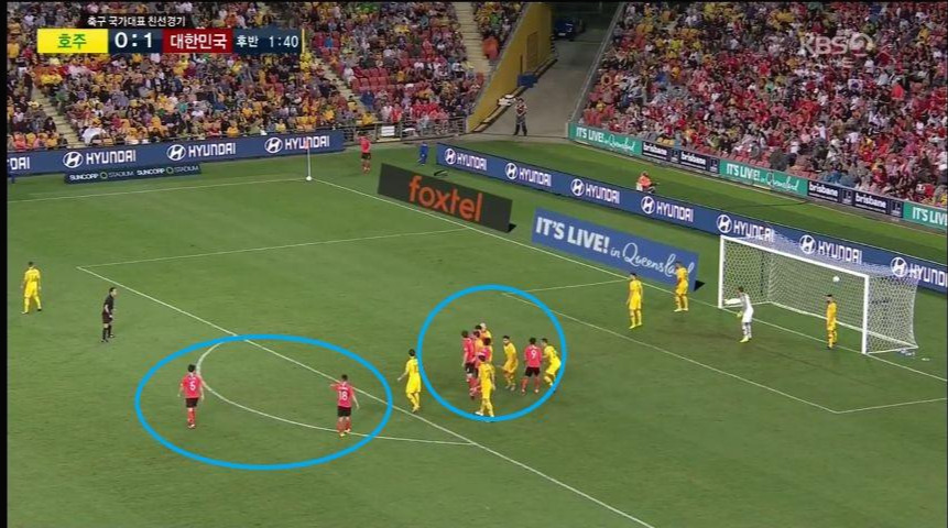- 대한민국의 코너킥 상황 시 선수들이 PK박스 내부에 완전히 진입해 있지 않은 상태에서 박스 바깥쪽에는 세컨드볼을 기다리는 선수를 배치함으로써 변칙적인 코너킥 전술을 기대하게 함. 밀집해 있던 선수가 넓게 퍼질 수 있을 뿐만 아니라 저 상태로 골문 앞 까지 진행하여 골을 성공할 수 있음. 여러가지 전술이 가능한 형태임.