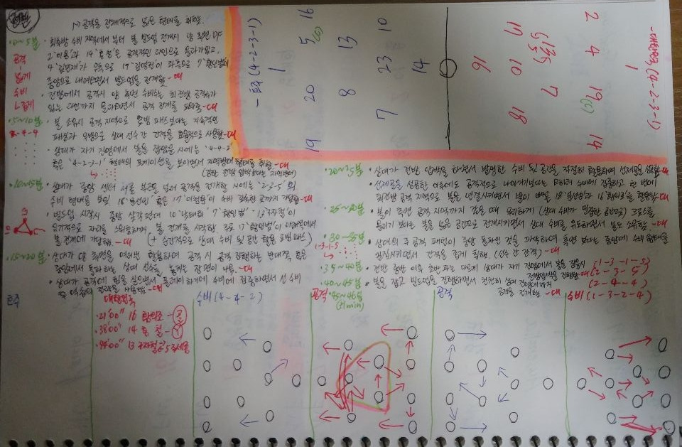 1. 상대가 공격적으로 강하게 경기를 진행하면서 수비에 집중하는 모습이 자주 나왔다. 이 때, 수비 전술을 한 가지로만 구성하지 않고 상대가 볼을 어느 지점에 가지고 있느냐에 따라 다른 수비 형태와 다른 압박 지접을 보이면서 상대가 원활하게 공격을 전개하지 못하도록함.