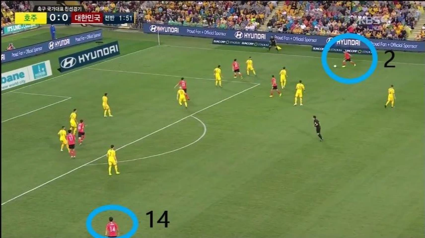 - 양 측면 수비수 '이용'(2번)과 '홍철'(14번)은 볼이 상대 진영에 위치할 때 적극적으로 오버래핑(Overlapping)하면서 공격 전개에 힘을 실어주는 모습이 보임.