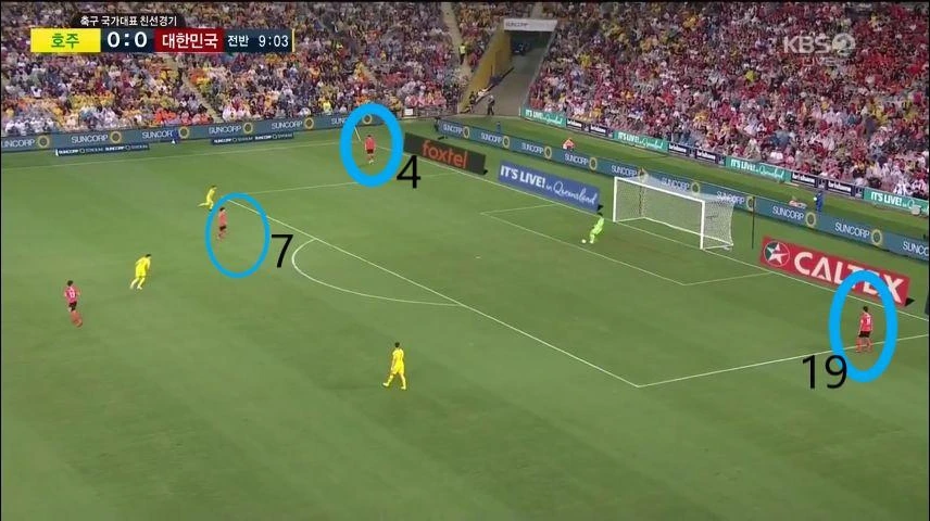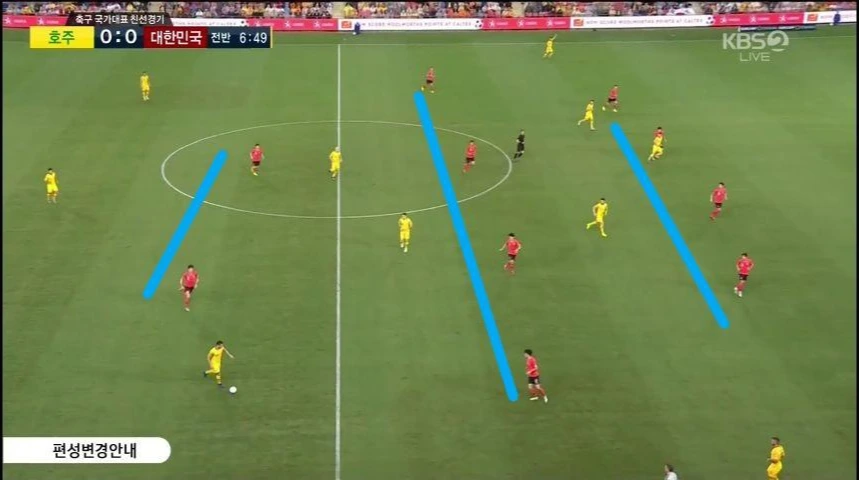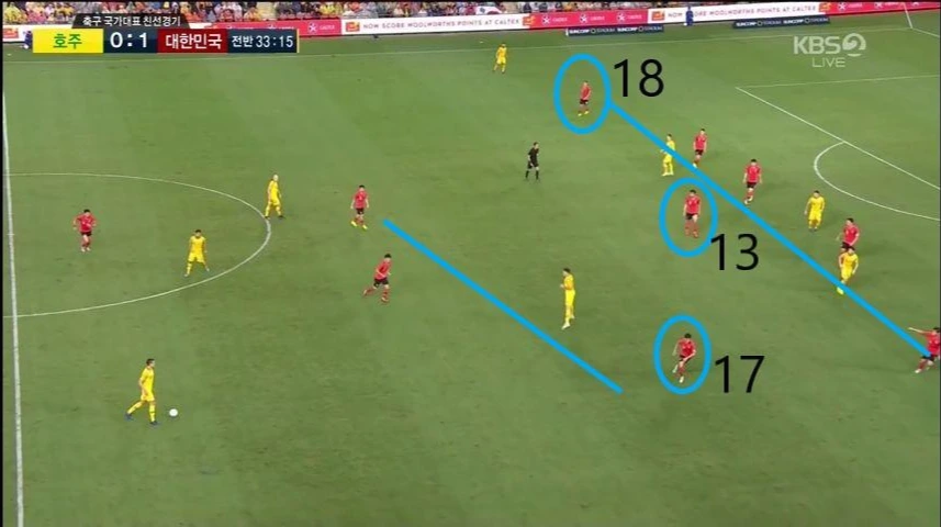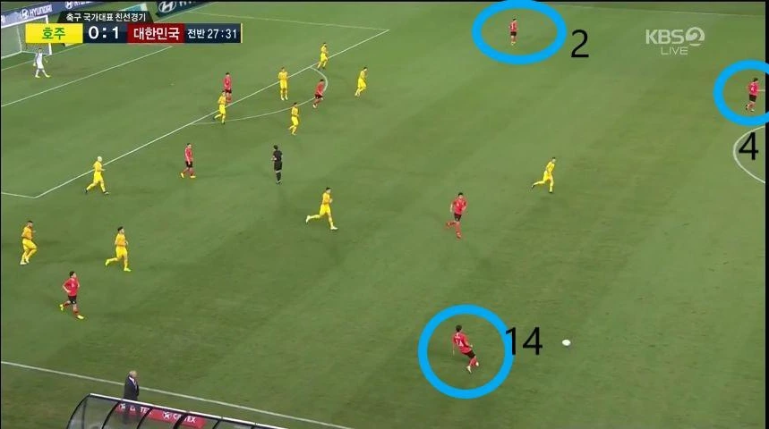 - 최후방 수비지역에서 부터 빌드업(Build-up) 전개 시 양 측면 수비수인 '이용'(2번)과 '홍철'(14번)은 라인을 높이 올리며 공격에 가담할 준비를 함. 이와 동시에, '김민재'(4번)가 우측으로 '김영권'(19번)이 좌측에서 중앙으로 이동하고, 좌측 빈자리를 '황인범'(7번)이 자리하면서 3백 형태를 유지한 상태로 빌드업 전개를 시작함.