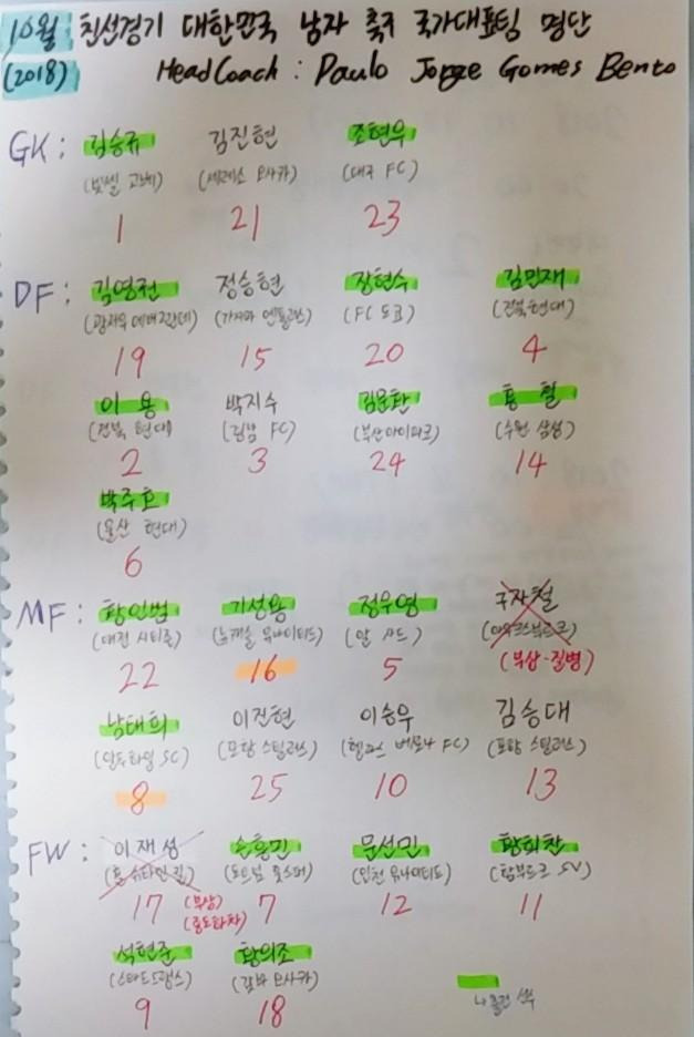 아쉽게 최종 명단에는 포함되지 못했지만 예비 명단에 이름을 올린 ‘이진현(21세, 포항스틸러스)’과 ‘김준형(22세, 수원 삼성)’에 대해서는 “현재도 몸 상태가 좋지 않은 선수들이 있기 때문이다. 이진현은 10월 당시 선발을 해서 데려온 선수이며, 김준형은 더 어리고 기술적으로 좋은 인상을 많이 받았다. 발전의 기회를 주고자 했다.”라며 그동안 두 선수가 자신의 장점을 여실히 보여주며 좋은 경기력으로 어필하였기에 혹여나 있을 부상자를 대체하기 위한 예비 명단에 이름을 올렸다고 덧붙였다.