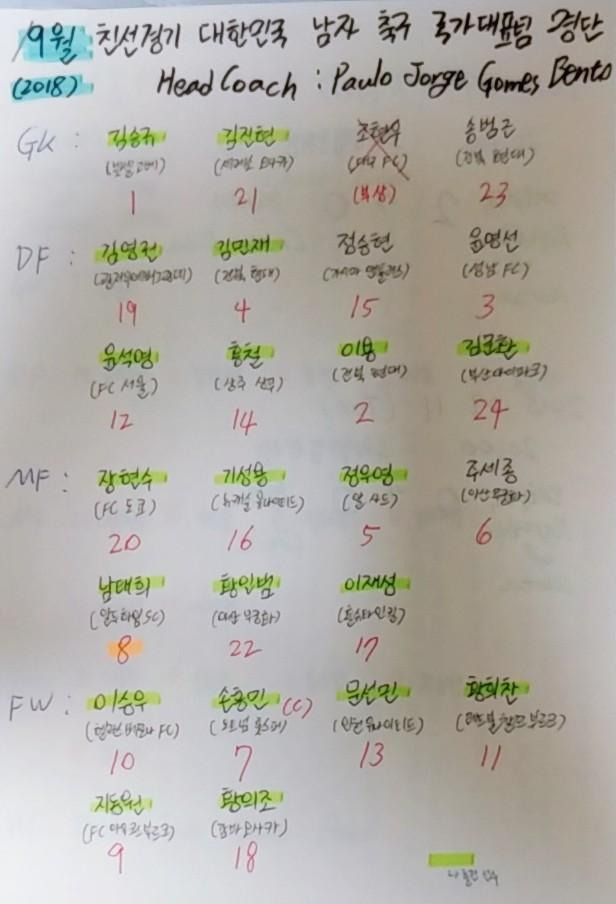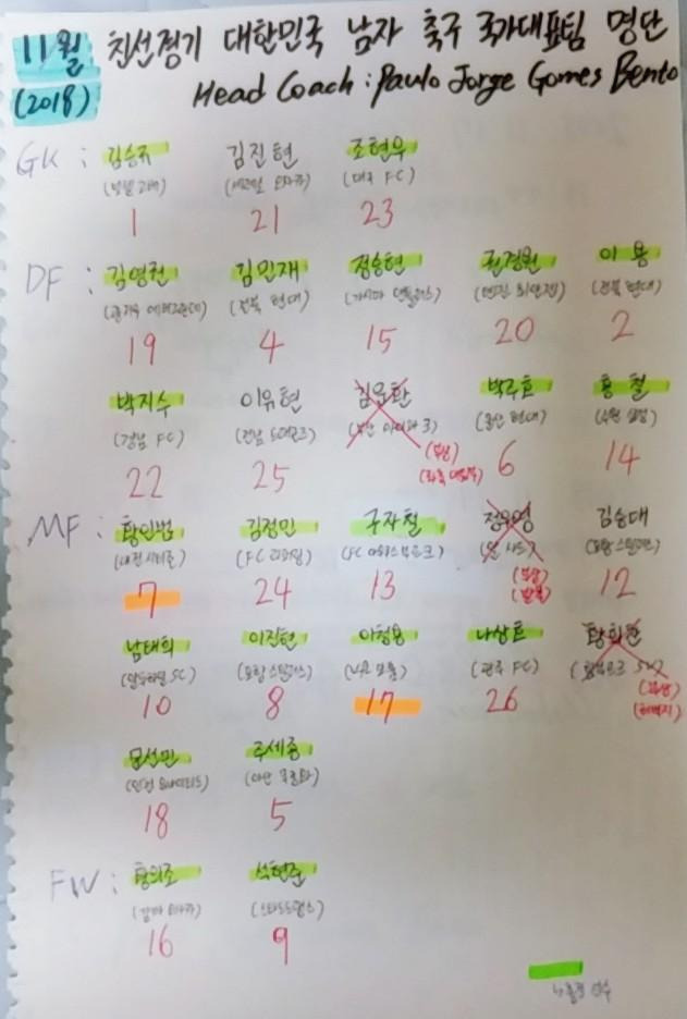 벤투 감독이 이끄는 대한민국 축구 국가대표팀은 지난 3개월간 총 6차례의 평가전을 통해 여러 유형의 선수들을 실험해보았다. 팀 전술에 가장 어울리는 선수를 찾기 위해 고군분투하였다. 총 36명의 선수(GK-4명, DF-12명, MF-15명, FW-5명)가 모의고사를 보았고, 그중 25명의 선수(최종 23명, 예비 2명)가 이번 아시안컵 발탁의 명예를 가질 수 있었다. (김진수는 부상으로 인해 평가전에는 뛰지 못했으나 “지속적으로 눈여겨보았다”라는 벤투 감독의 말을 빌려 이번 대회에 채택되었음을 알 수 있다.)