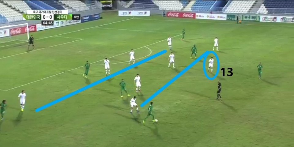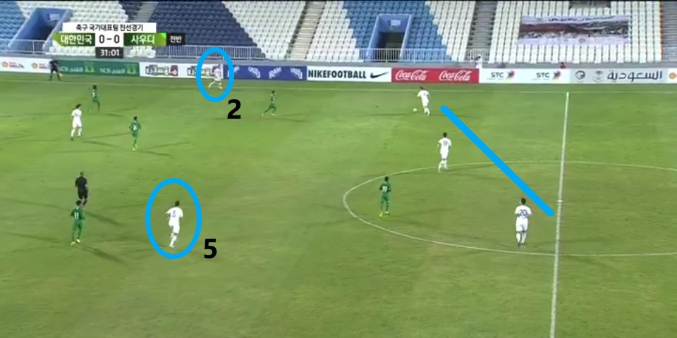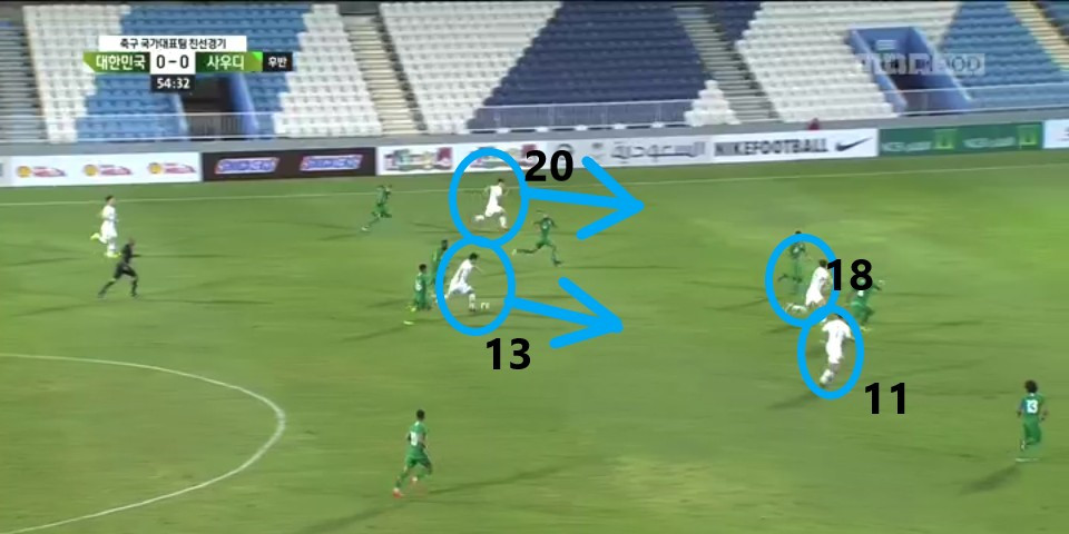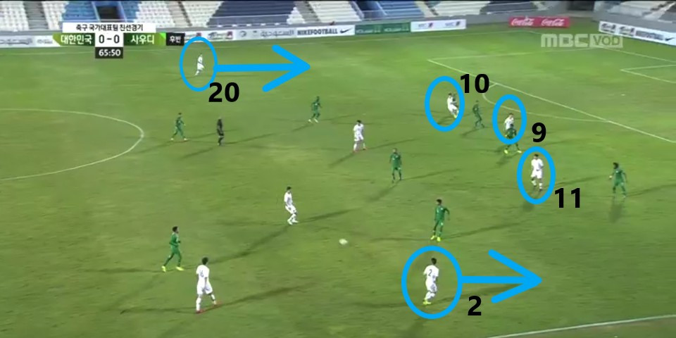 - '지동원'(9번)과 '이재성'(10번) 그리고 '황희찬'(11번)이 상대 최후방 수비수들과 중앙 지역에서 동일 선상에 위치하고 움직이기에 자연스럽게 측면이 벌어지는 상황이 발생함. 이를 '이용'(2번)과 '권경원'(20번)이 오버래핑(Overlapping)으로 측면을 적극 활용함.