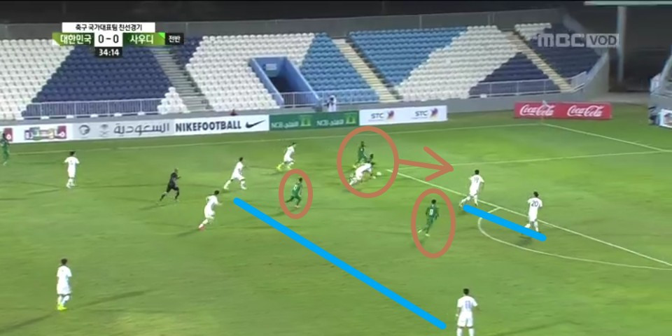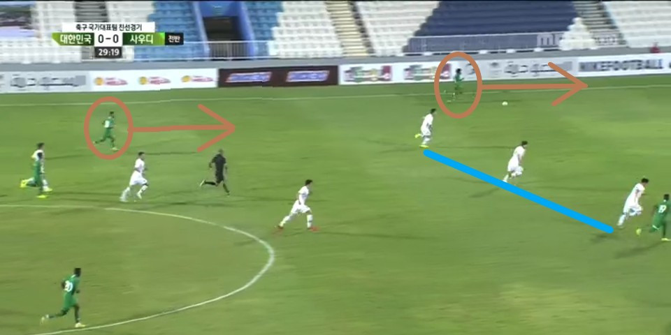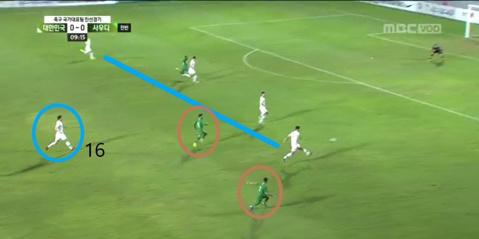 - 이 상황도 마찬가지로 상대 공격자원들을 순간적으로 놓치는 상황이 발생함. 최종 DF(수비)라인과 MF(미드필더)라인 사이 공간을 파고드는 상대 선수가 2명이나 위치함. 또한, 측면 지역을 상대 선수에게 허용하는 등 위험한 상황이 연출됨.