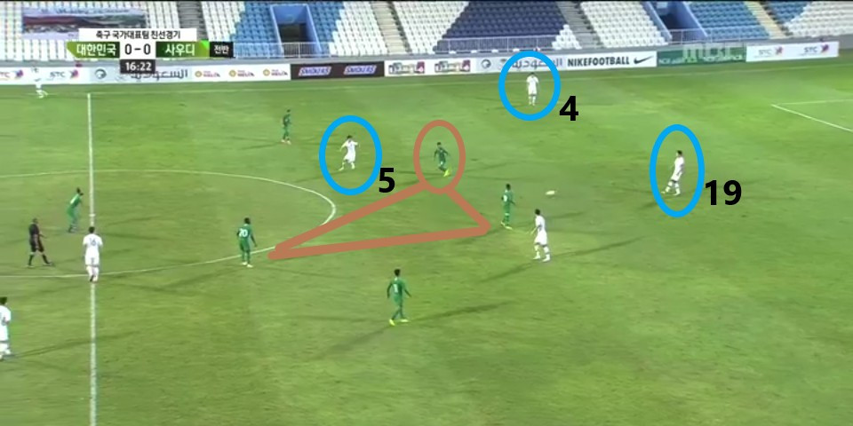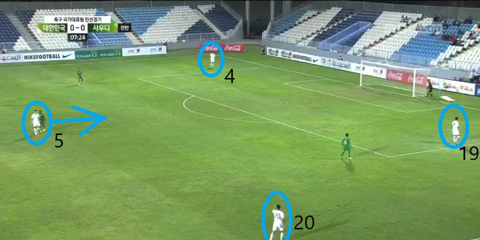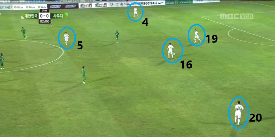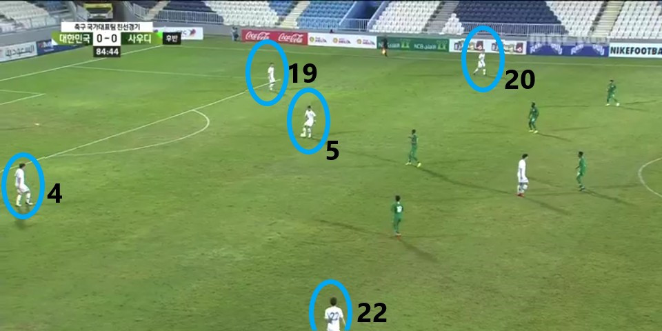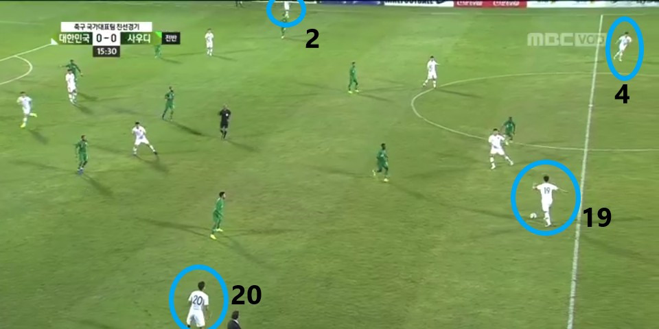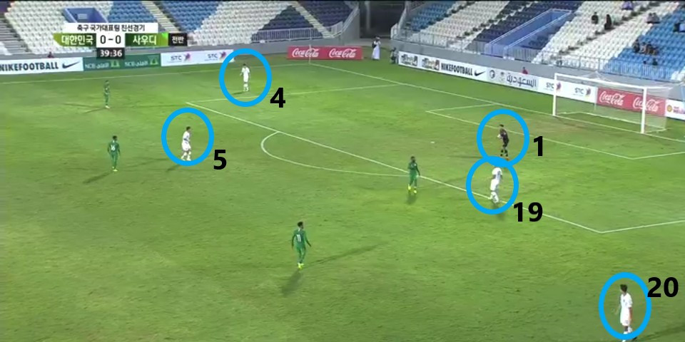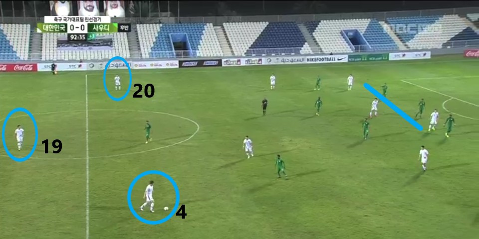 - GK '김승규'(1번)이 볼을 잡자 바로 '김민재'(4번)와 '김영권'(19번)이 양 옆으로 간격을 벌리는 모습을 보임. 동시에 '권경원'(20)번은 좌측면으로 이동하고 '정우영'(5번)이 중앙 빈 공간으로 들어오면서 볼을 받을 준비를 함.