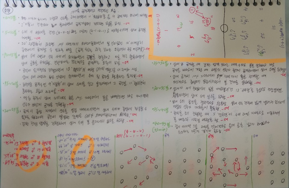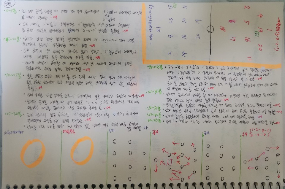 - 앞선 사진과 이어지는 영상임. 선수들간의 지속적인 움직임이 가장 중요한 부분임. 좌우 측면을 모두 활용하여 상대 수비를 교란 시킨 뒤 공간을 활용한 돌파로 상대 골문을 위협함.