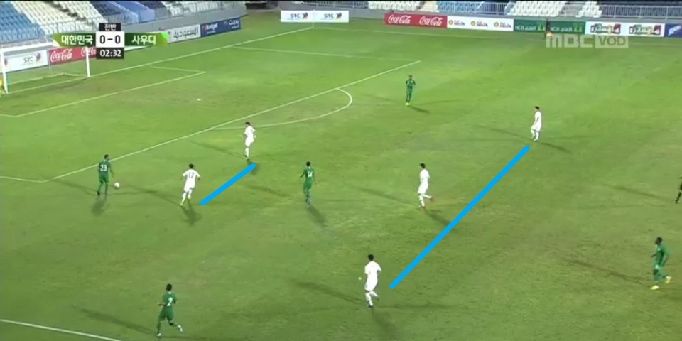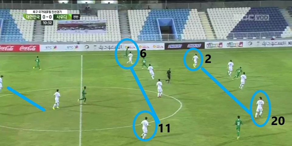 - 공격 시작 시 3백을 형성하던 수비라인이 선수 간격을 넓게 벌리면서 '김민재'(4번)와 '권경원'(20번)이 측면으로 이동함. 동시에 '기성용'(16번) 혹은 '정우영'(5번)[앞 뒤로 위치하여 중간 다리 역할 수행.]이 최종 수비수 '김영권'(19번)과 함께 MF(미드필더)지역으로의 볼 배급 역할을 함.
