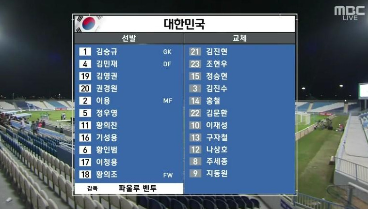 - 이번에는 수비 라인이 '4-4-2'전형임. DF(수비)라인에서는 '권경원'(20번)과 '김문환'(22번)이 가장 끝 점을 형성하지만 상대의 주 공격 방향이 중앙이기에 중앙에 밀집하여 위치함. 또한, 상대 측면 공격수를 동시에 차단하기 위해 MF(미드필더)라인에서는 '이재성'(10번)과 '황희찬'(11번)이 좌우로 넓게 벌려서 있는 모습임.