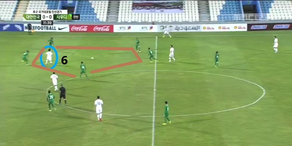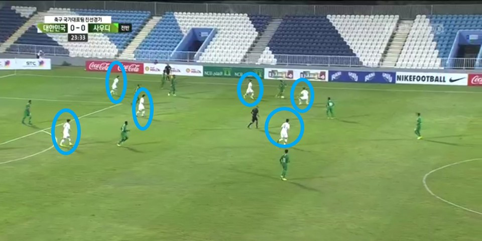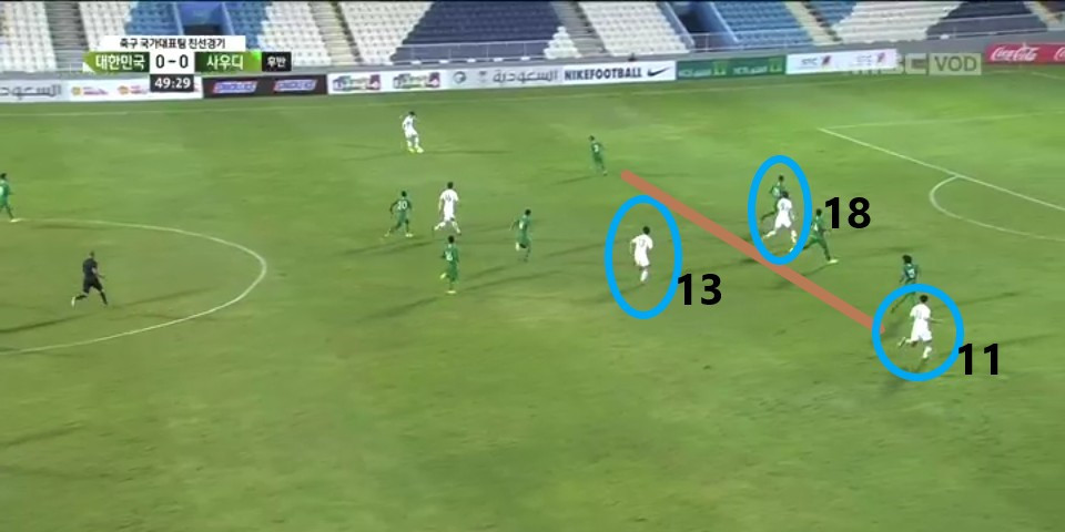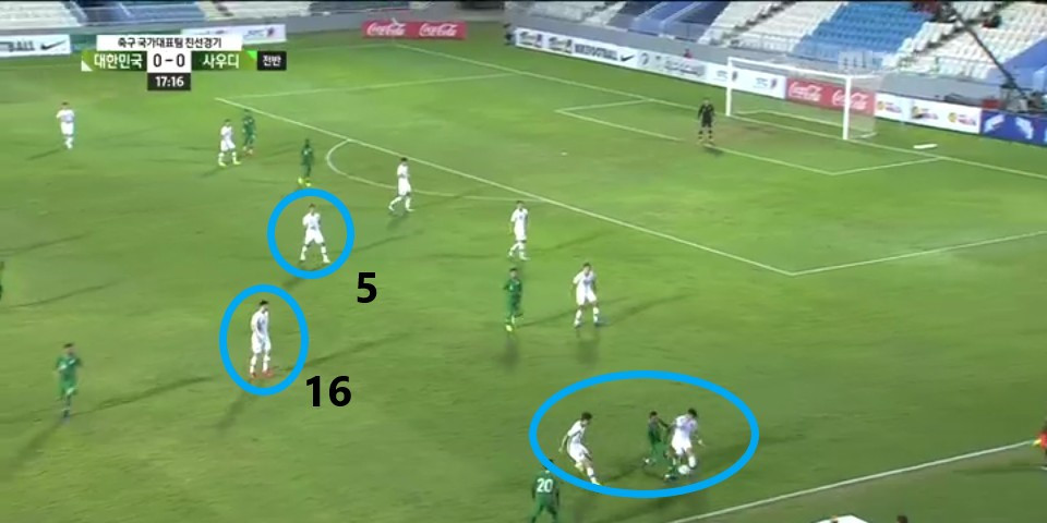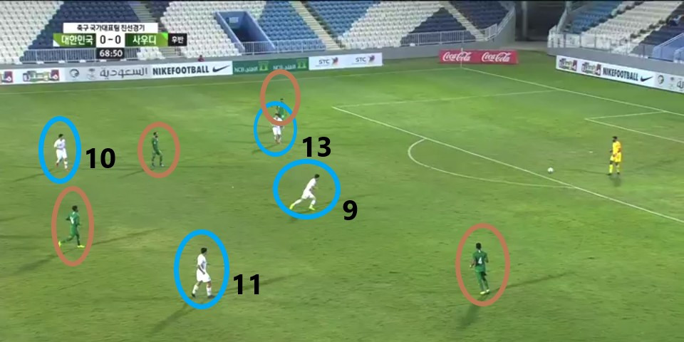 - '구자철'(13번)을 주축으로 하여 전방 압박을 펼침. '지동원'(9번), '이재성'(10번), '황희찬'(11번)이 상대 수비수 주위에서 볼을 차단하기 위한 움직임을 보임. 공격수와 수비수 숫자가 동일함. 상대가 체력적으로 부담을 느끼는 시점임을 알 수 있음.